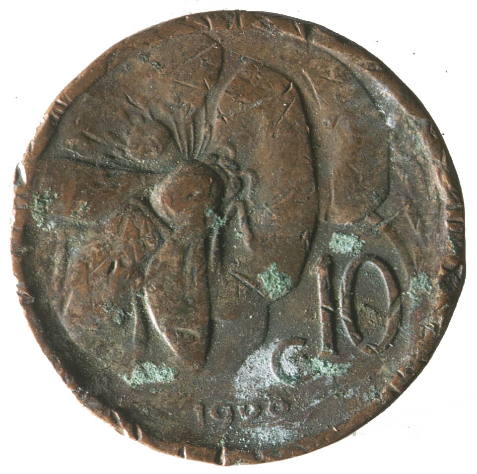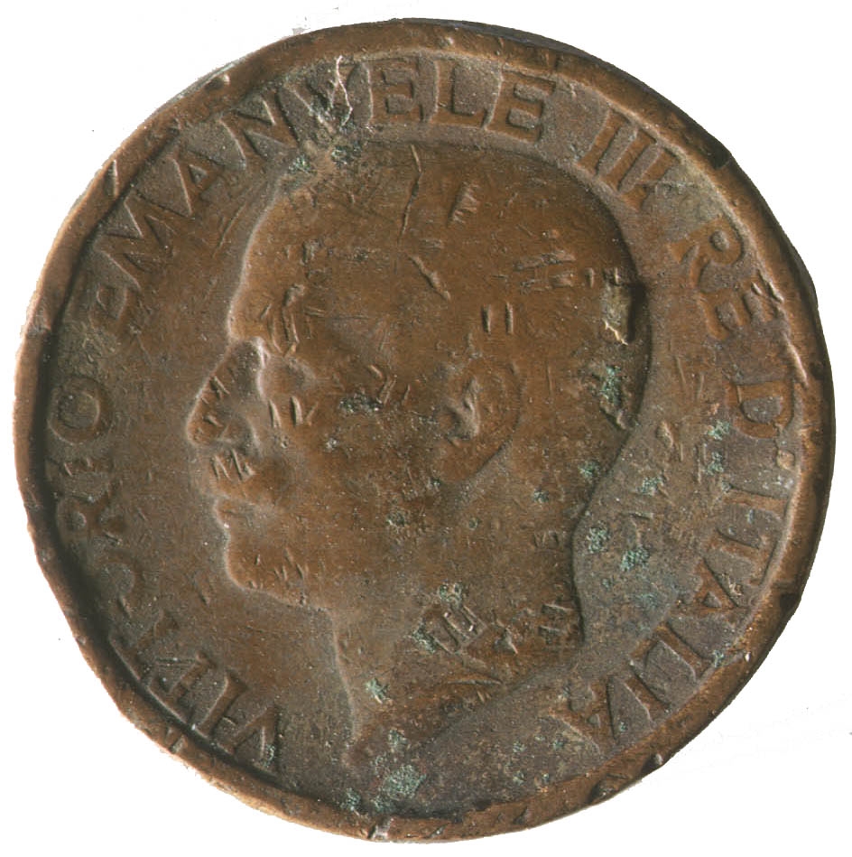 Avers: Centralni dio kovanice zauzima profil osobe sa pogledom u lijevo. Uz rub cijele kovanice proteže se natpis VITTORIO EMANVELE III RE D''ITALIA. Revers: Dvije trećine površine zauzima prikaz pčele na cvijetu. Uz desni doljnji rub kovanice nalazi se natpis c10, a uz lijevi donji rub veliko slovo R. Na samon dnu nalazi se godina 1929. Kovanica je načeta korozijom.