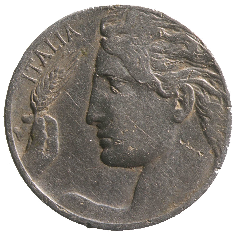 Profil žene u lijevo, koja u ruci drži klas pšenice iznad kojeg se, prateći rub kovanice, nalazi natpis ITALIA.