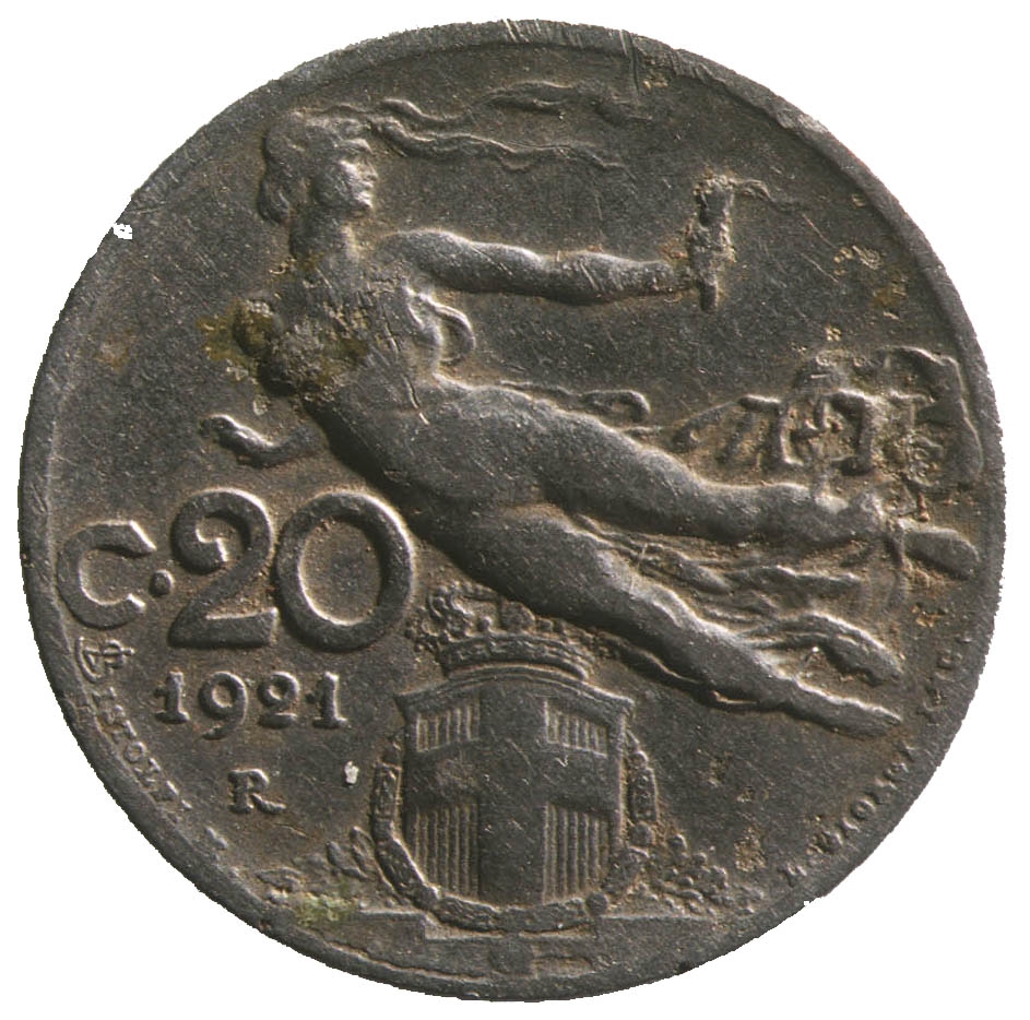Dvije trećine kovanice zauzima prikaz gole žene u letu koja u lijevoj ruci drži baklju. Uz lijevi rub kovanice nalazi se natpis C.20, a ispod njega godina 1921. i slovo R. Na dnu se nalazi grb u obliku štita u čijem se središtu nalazi križ. Iznad središnjeg djela štita nalazi se kruma.