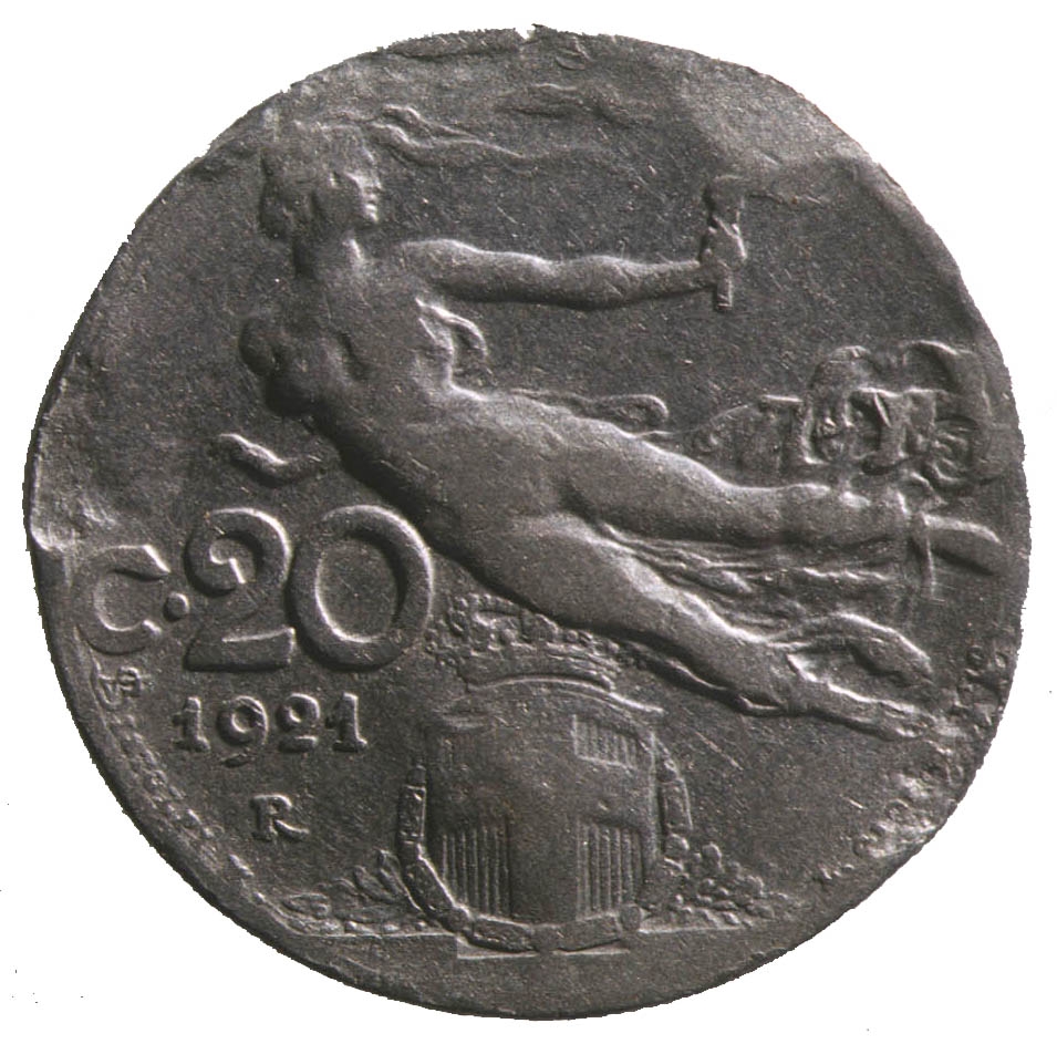 Avers: Profil žene u lijevo, koja u ruci drži klas pšenice iznad kojeg se, prateći rub kovanice, nalazi natpis ITALIA. Revers: Dvije trećine kovanice zauzima prikaz gole žene u letu koja u lijevoj ruci drži baklju. Uz lijevi rub kovanice nalazi se natpis C.20, a ispod njega godina 1921. i slovo R. Na dnu se nalazi grb u obliku štita u čijem se središtu nalazi križ. Iznad središnjeg djela štita nalazi se kruma.