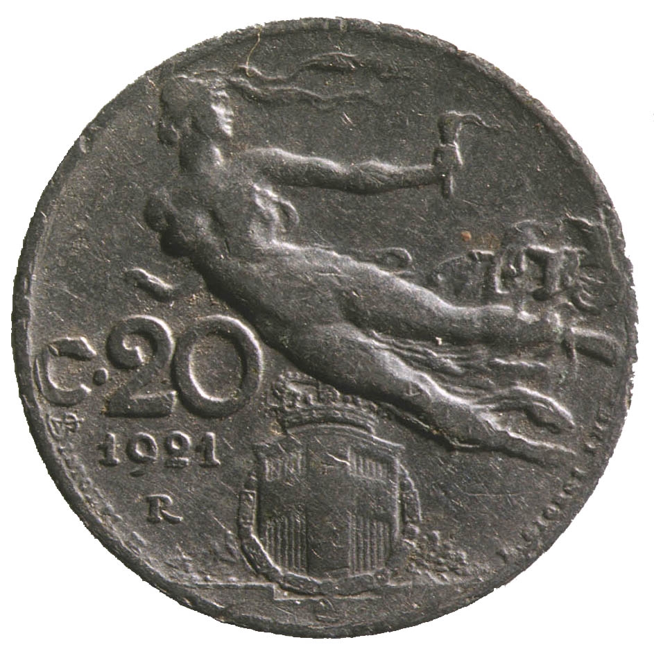 Dvije trećine kovanice zauzima prikaz gole žene u letu koja u lijevoj ruci drži baklju. Uz lijevi rub kovanice nalazi se natpis C.20, a ispod njega godina 1921. i slovo R. Na dnu se nalazi grb u obliku štita u čijem se središtu nalazi križ. Iznad središnjeg djela štita nalazi se kruma.