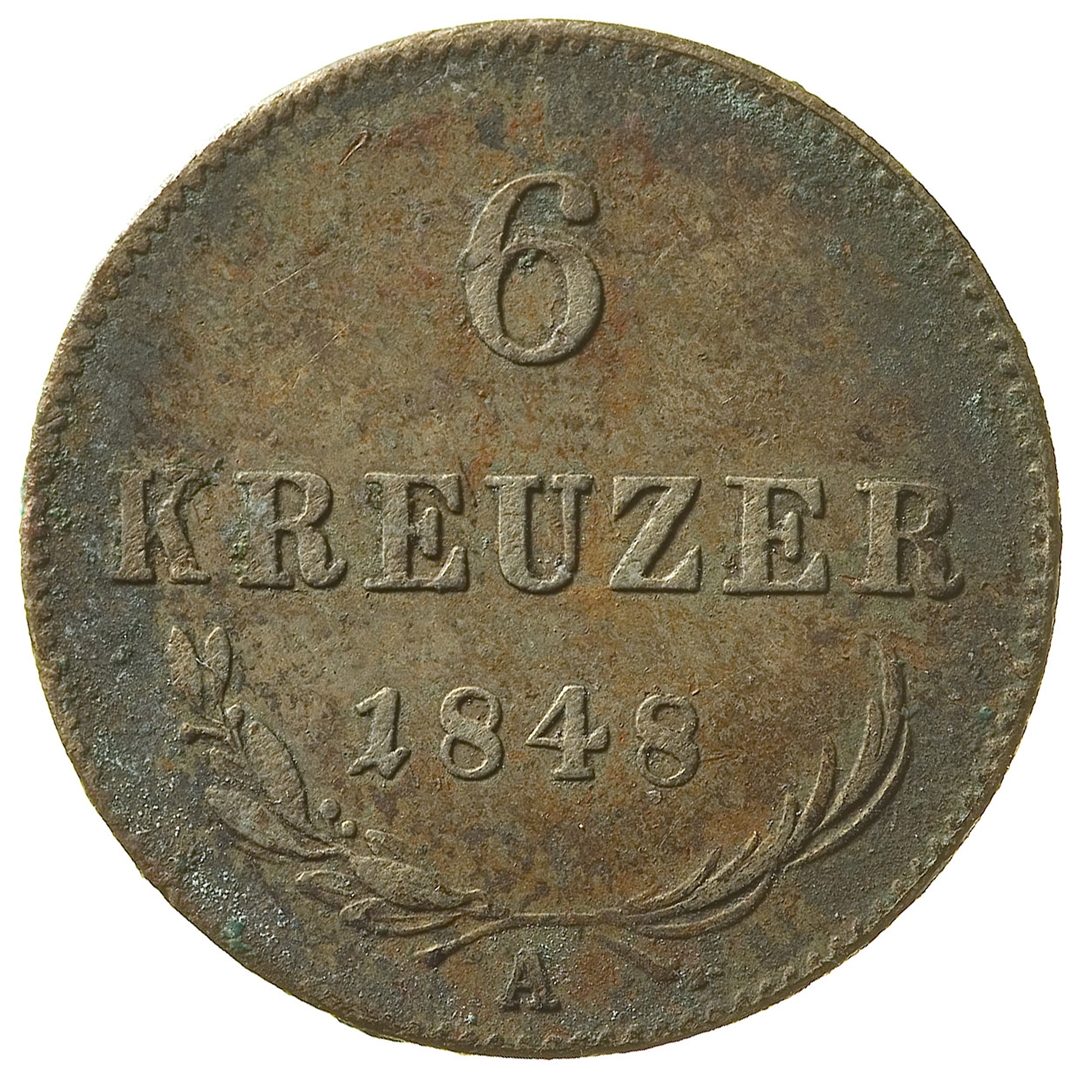 Avers: U sredini štit u kojem se nalazi dvoglavi orao. Iznad štita nalazi se kruna, a uz rub natpis SCHEIDEMUNZE K.K. OESTERREICHISCHE. Revers: U sredini natpis u tri reda 6 / KREUZER / 1848. Na dnu ispod dviju grančica (lovor i palma) oznaka kovnice A.