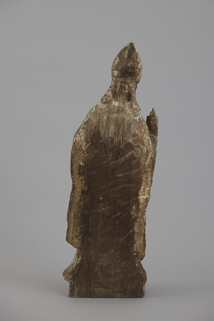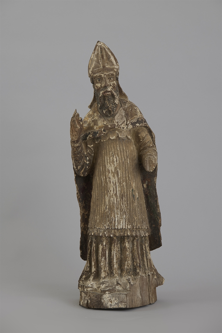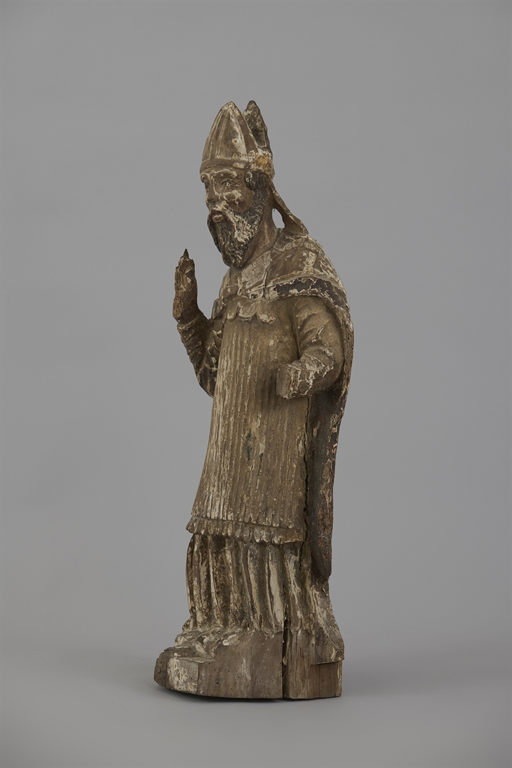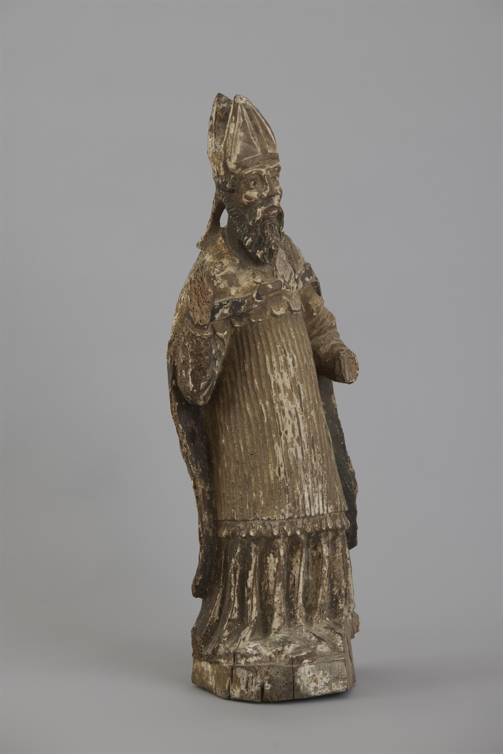 Svetac sa tiarom na glavi i crnom bradom. Haljina sa malim naborima u obliku kanalatura završava se čipkom. Podsuknja sa većim naborima do poda. Plašt spojen na grudima. Desna ruka uzdignuta u blagoslov. Lijeva spuštena fali. Boja neodređena. Po cijeloj površini vidi se gips. Oštećen crvotočinom. (Inventarna knjiga 1-3, 1. tom)