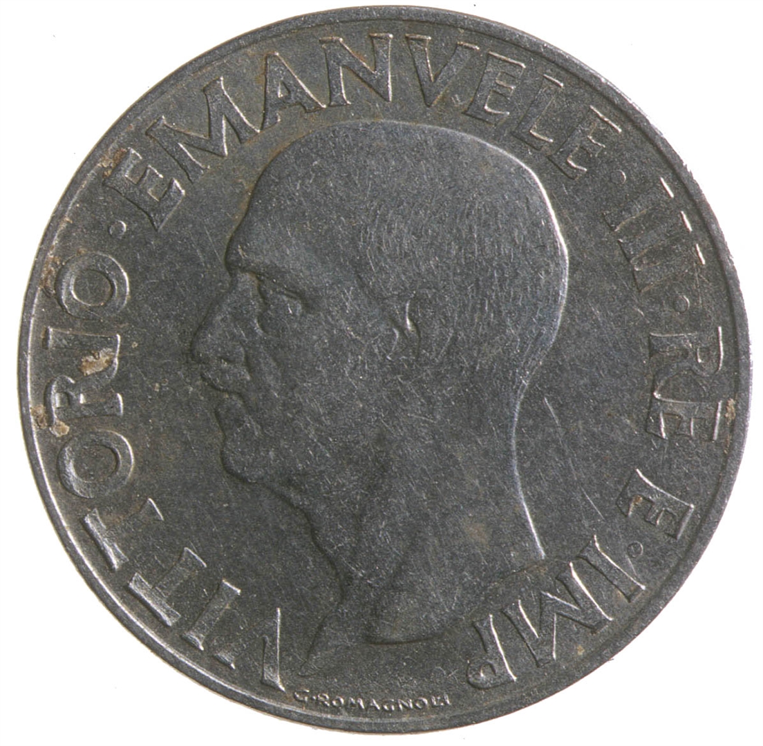 Centralni dio kovanice zauzima profil muške osobe sa pogledom u lijevo. Kružno uz rub kovanice proteže se natpis VITTORIO. EMANVELE. III. RE. E. IMP.. Na dnu uz rub nalazi se natpis G.ROMAGNOLI.