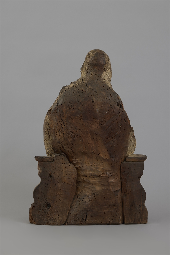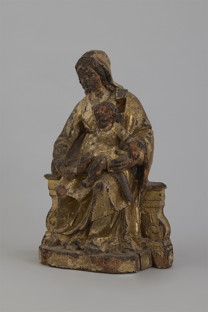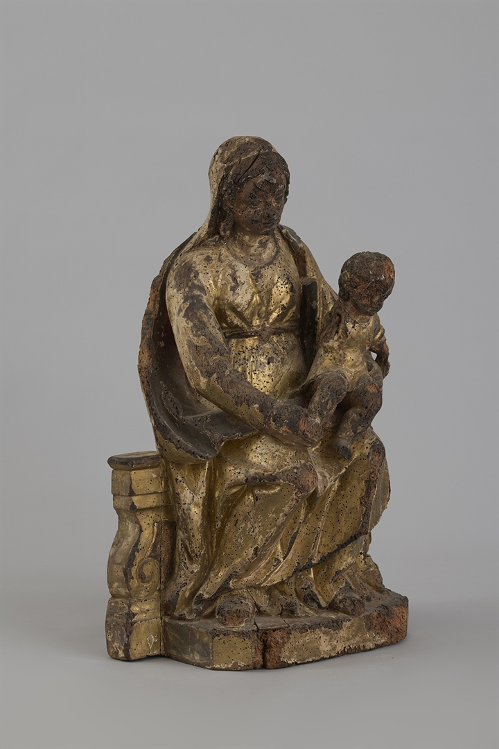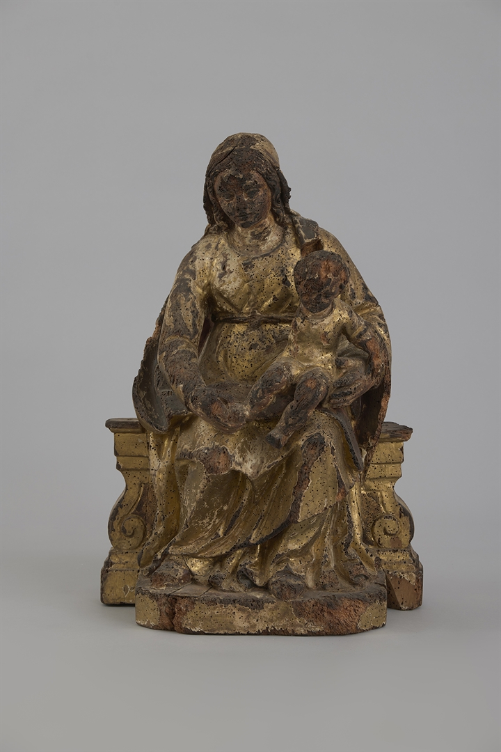 Madona s dijetetom sjedi na ornamentiranom sjedištu. Glava spuštena sa jako tamnim inkarnatom. Bijeli veo iz koga vire duge kose. Desnom rukom pridržava desnu diječju nožicu. Lijevom rukom ga pridržava o kuku. Dijete u bijeloj kratkoj tunici je nagnuto dosta prema napred. Lijevom rukom se pridržava za majčinom lijevom rukom. Kompozicija jako potamnjela i oštećena. (Inventarna knjiga 1-3, 1. tom)