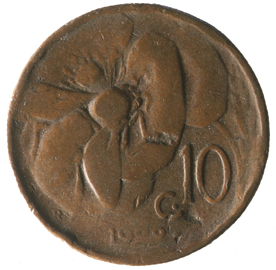 Avers: Centralni dio kovanice zauzima profil osobe sa pogledom u lijevo. Uz rub cijele kovanice proteže se natpis VITTORIO EMANVELE III RE D''ITALIA. Revers: Dvije trećine površine zauzima prikaz pčele na cvijetu. Uz desni doljnji rub kovanice nalazi se natpis c10, a uz lijevi donji rub veliko slovo R. Na samon dnu nalazi se godina 1929.