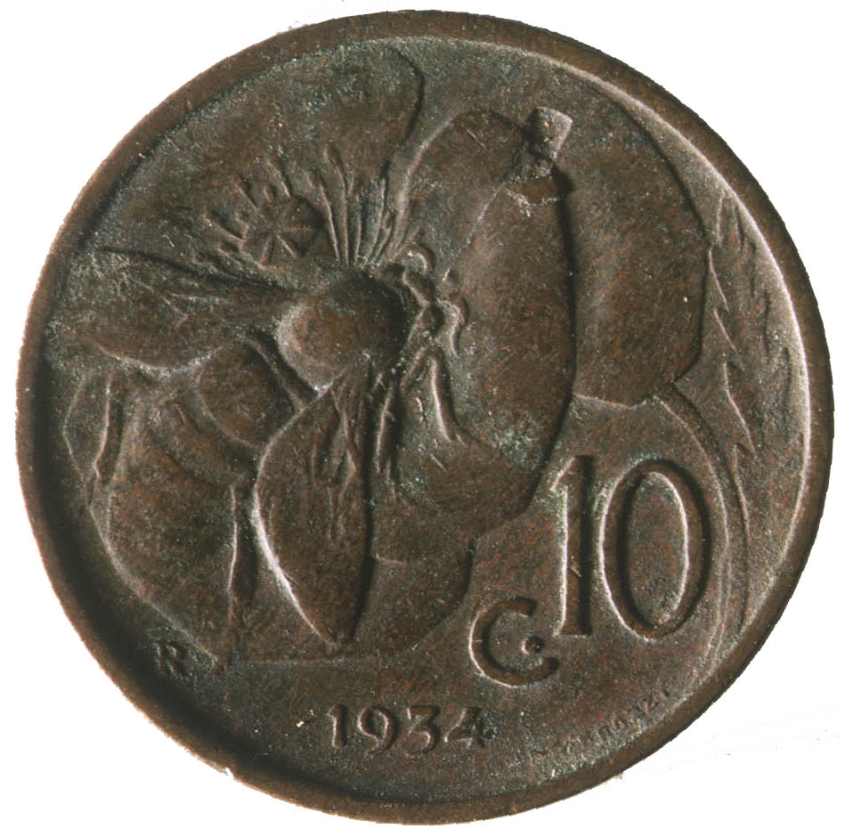 Avers: Centralni dio kovanice zauzima profil osobe sa pogledom u lijevo. Uz rub cijele kovanice proteže se natpis VITTORIO EMANVELE III RE D''ITALIA. Revers: Dvije trećine površine zauzima prikaz pčele na cvijetu. Uz desni doljnji rub kovanice nalazi se natpis c10, a uz lijevi donji rub veliko slovo R. Na samon dnu nalazi se godina 1934.