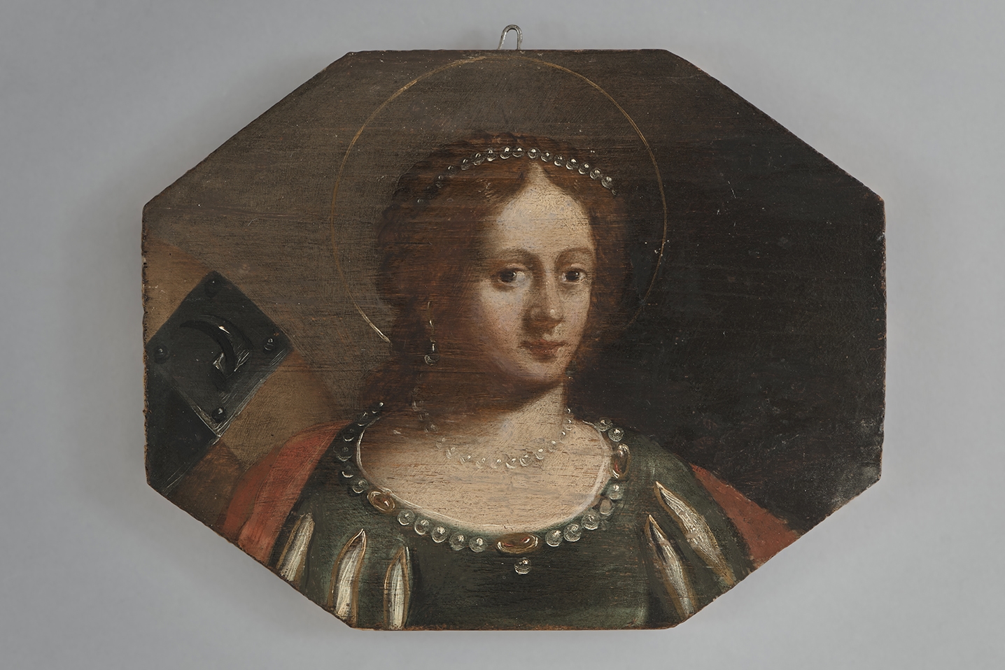 Dvije drvene oslikane pločice u obliku horizontalno produženog osmerokuta najvjerojatnije su izvorno bile umetnute u drvenu rezbarenu oplatu neke kapele ili su bile dijelom ukrasa na nepoznatom oltaru. Moguće je, stoga, pretpostaviti da je riječ o fragmentima izgubljene cjeline i većeg niza prikaza. Obje su svetice prikazane u poprsju. Sv.Katarina je odjevena u plavozelenu haljinu s crvenim plaštem. Otvor haljine opšiven je perlama i dragim kamenjem, a svetica je još urešena bisernom ogrlicom, naušnicama i niskom perli u kosi. Lijevo iza nje vidi se dio velikog kotača sa šiljcima. Sv. Barbara je odjevena u sivo-plavu haljinu ukrašenu s tri medaljona koji pridržavaju svijetlo-plavu maramu oko njezina otvora. Kosa joj je ukrašena sivo-plavom trakom. Lijevo iza nje prikazana je četvrtasta siva kula s tri malena okulusa. Pozadina obaju prizora je siva, a jednom stranom u tamnoj sjeni. Smireni oblici naglašenog plasticiteta, udruženi s velikom pažnjom posvećenom dekorativnom detalju, predstavljaju autora dvaju osmerokuta iz rovinjskog muzeja kao sljedbenika akademizirajuće struje venecijanskog slikarstva s kraja 17. stoljeća koja se u talijanskoj literaturi naziva barocchetto. Način oblikovanja volumena, igra svjetla i sjene, zaglađena faktura s ljupkim lumeggiaturama na detaljima, kako fizionomije, tako i nakita svetica, ukazuju na to da se autor dvaju osmerokuta iz rovinjskog muzeja kao sljedbenika akademizirajuće struje venecijanskog slikarstva s kraja 17. stoljeća koja se u talijanskoj literaturi naziva barocchetto. Način oblikovanja volumena, igra svjetla i sjene, zaglađena faktura s ljupkim lumeggiaturama na detaljima, kako fizionomije, tako i nakita svetica, ukazuju na to da se autor dvaju osmerokuta nužno susreo sa slikarstvom Pietra Liberija (Padova 1605. - Venecija 1687.) i širokog kruga njegovih sljedbenika. (Višnja Bralić u: Slikarska baština Istre, 2006., str. 454-455)