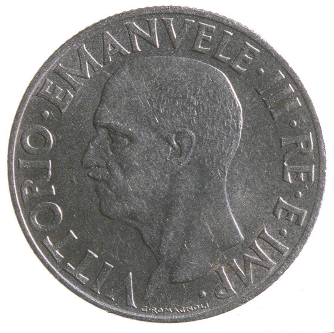 Centralni dio kovanice zauzima profil muške osobe sa pogledom u lijevo. Kružno uz rub kovanice proteže se natpis VITTORIO. EMANVELE. III. RE. E. IMP.. Na dnu uz rub nalazi se natpis G.ROMAGNOLI.