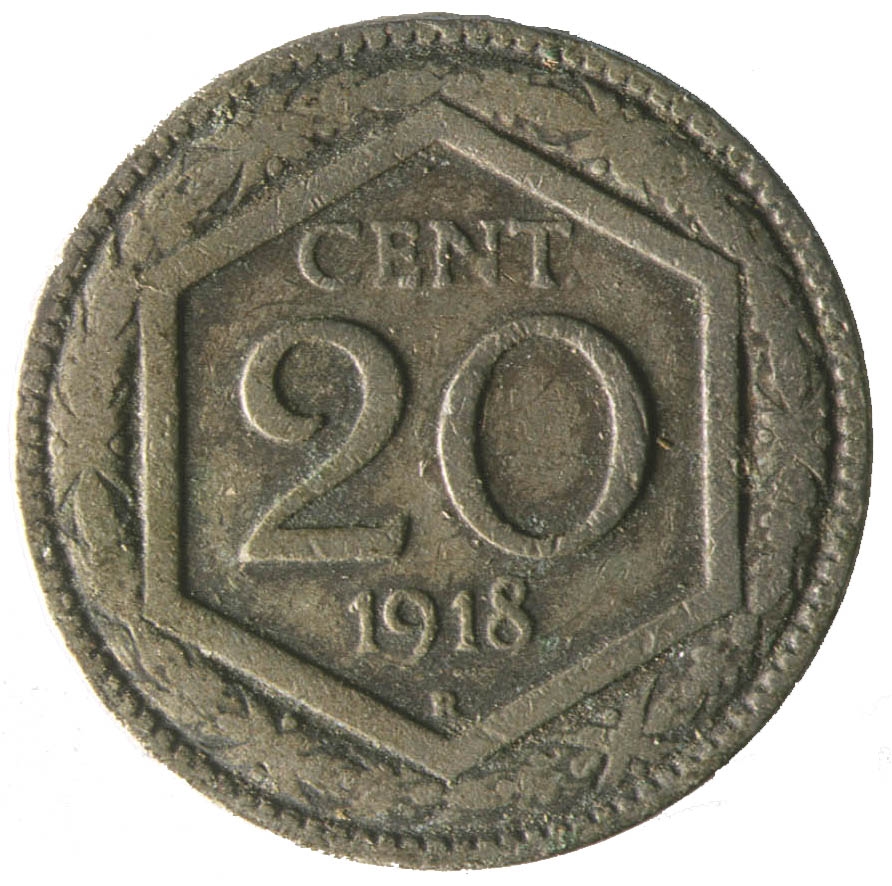 Središnji dio zauzima pravilni šesterokut, u čijem se gornjem djelu nalazi natpis CENT. a ispod njega veliki broj 20. Na dnu šesterokuta nalazi se godina 1918., a ispod nje slovo R. Uz nazubljeni obrub smješten je vjenac od lišća.