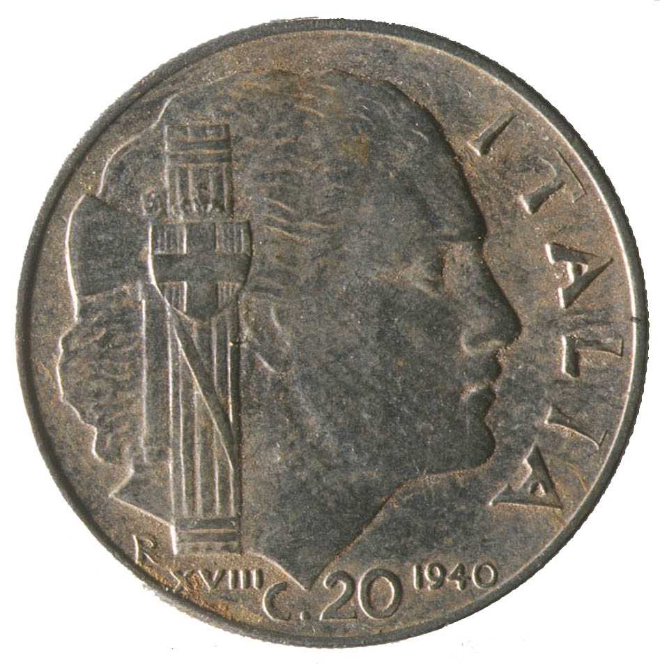 Centralni dio kovanice zauzima profil ženske osobe sa pogledom u desno. Sa njezine lijeve strane nalazi se fascio, a ispod njega slovo R i rimski brojXVIII. Uz desni rub nalazi se natpis ITALIA, a na dnu C.20 i godina 1940.