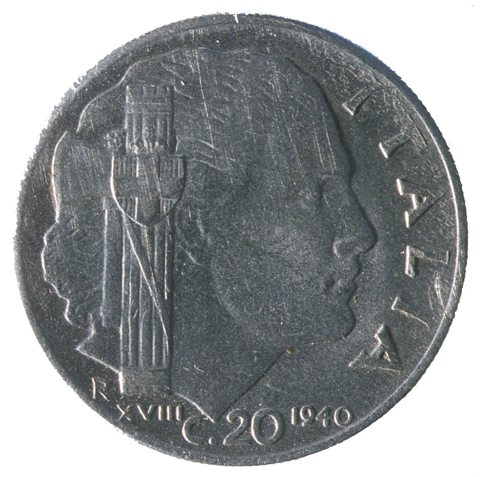 Centralni dio kovanice zauzima profil ženske osobe sa pogledom u desno. Sa njezine lijeve strane nalazi se fascio, a ispod njega slovo R i rimski brojXVIII. Uz desni rub nalazi se natpis ITALIA, a na dnu C.20 i godina 1940.