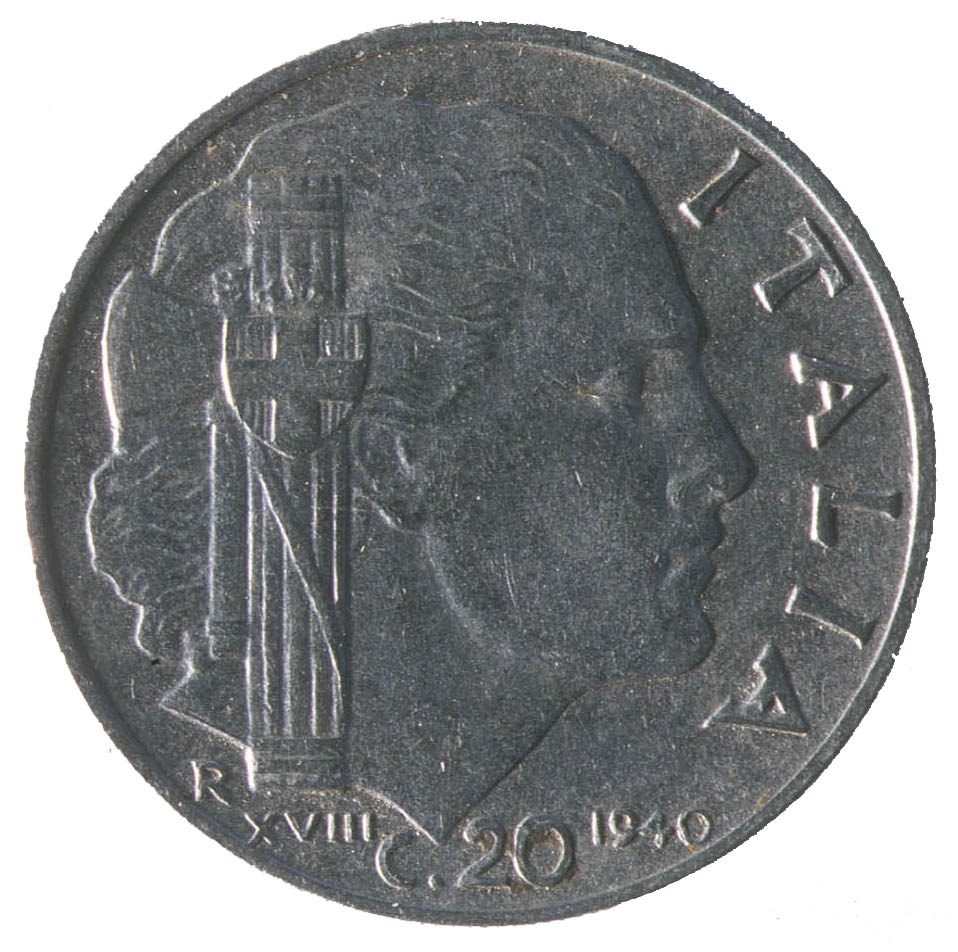 Centralni dio kovanice zauzima profil ženske osobe sa pogledom u desno. Sa njezine lijeve strane nalazi se fascio, a ispod njega slovo R i rimski brojXVIII. Uz desni rub nalazi se natpis ITALIA, a na dnu C.20 i godina 1940.