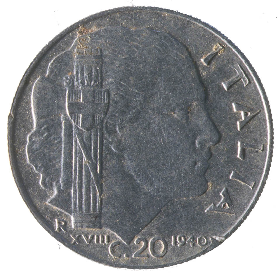 Centralni dio kovanice zauzima profil ženske osobe sa pogledom u desno. Sa njezine lijeve strane nalazi se fascio, a ispod njega slovo R i rimski brojXVIII. Uz desni rub nalazi se natpis ITALIA, a na dnu C.20 i godina 1940.