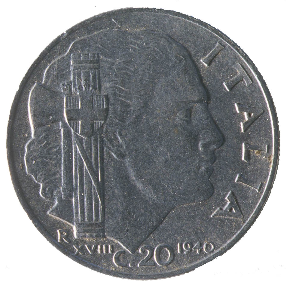 Centralni dio kovanice zauzima profil ženske osobe sa pogledom u desno. Sa njezine lijeve strane nalazi se fascio, a ispod njega slovo R i rimski brojXVIII. Uz desni rub nalazi se natpis ITALIA, a na dnu C.20 i godina 1940.