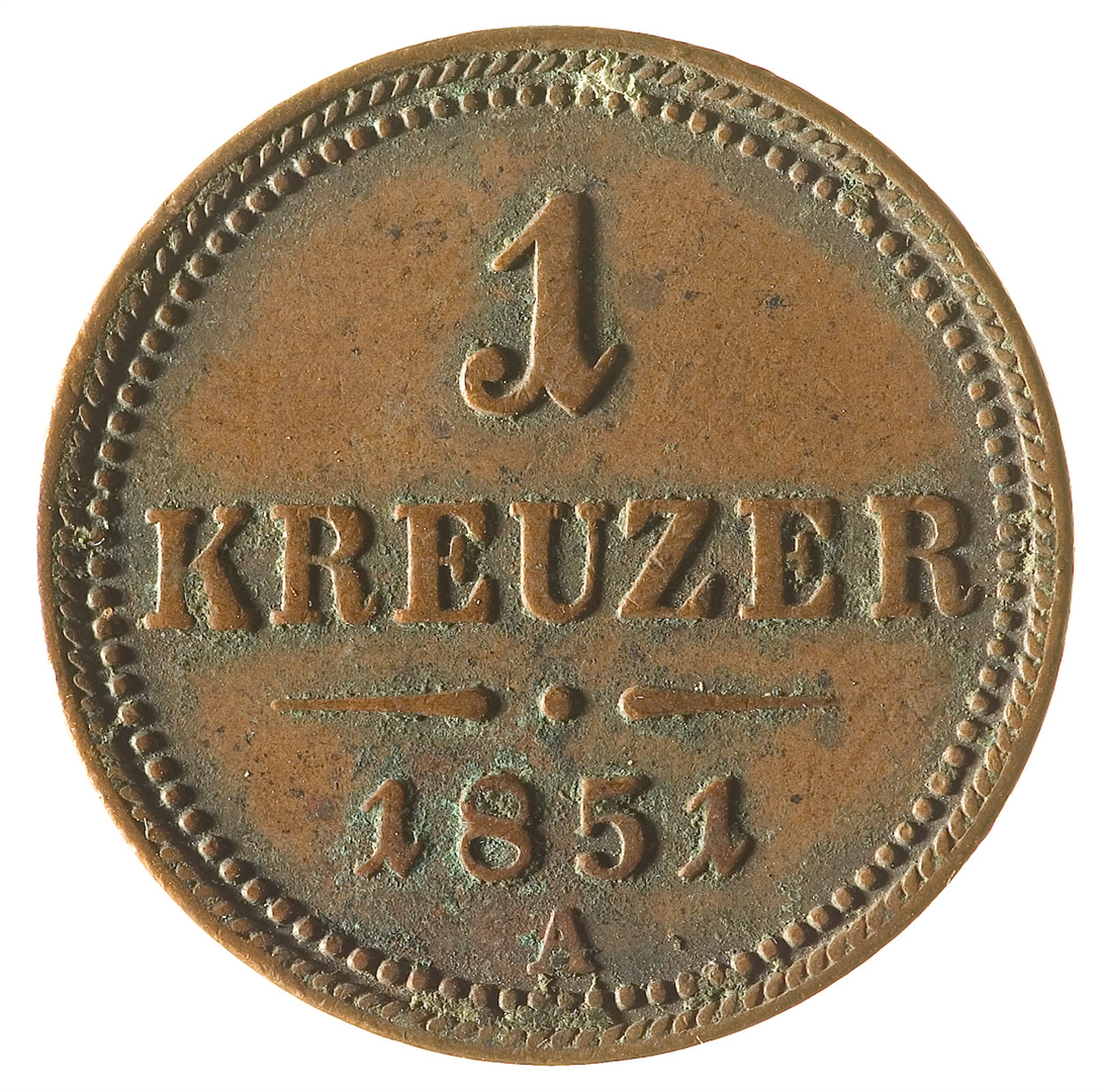 Avers: U sredini dvoglavi orao iznad kojeg se nalazi kruna. Uz rub natpis K·K·OESTERREICHISCHE SCHEIDEMÜNZE·. Revers: U sredini natpis u tri reda 1 / KREUZER / 1851. Na dnu oznaka kovnice A