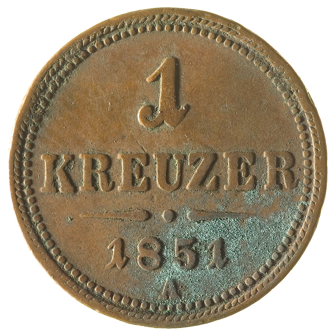Avers: U sredini dvoglavi orao iznad kojeg se nalazi kruna. Uz rub natpis K·K·OESTERREICHISCHE SCHEIDEMÜNZE·. Revers: U sredini natpis u tri reda 1 / KREUZER / 1851. Na dnu oznaka kovnice A.