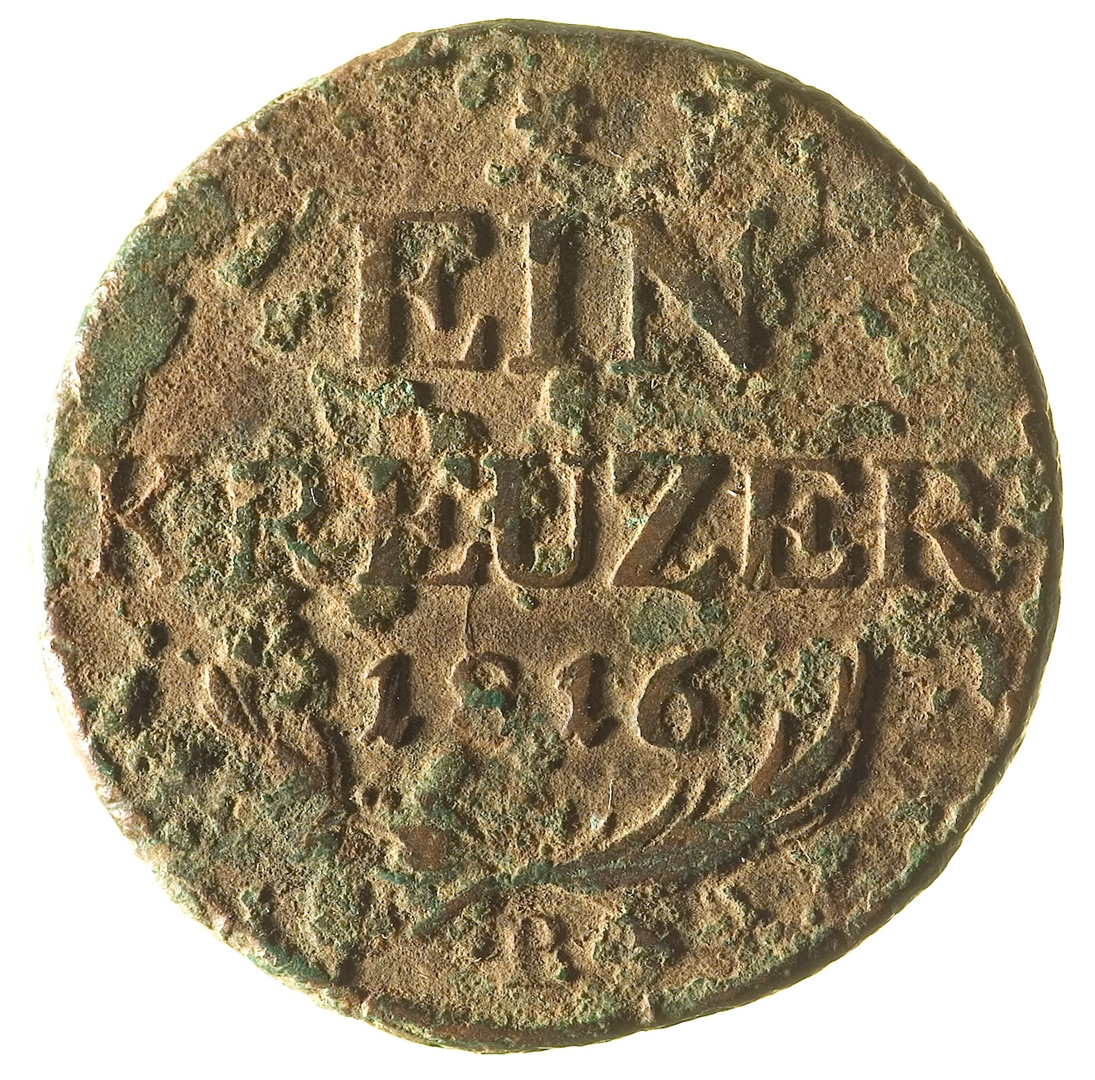 Na vrhu *, a u sredini natpis u tri reda EIN / KREUZER· / 1816·. Ispod natpisa dvije grančice ispod kojih se nalazi oznaka kovnice B.