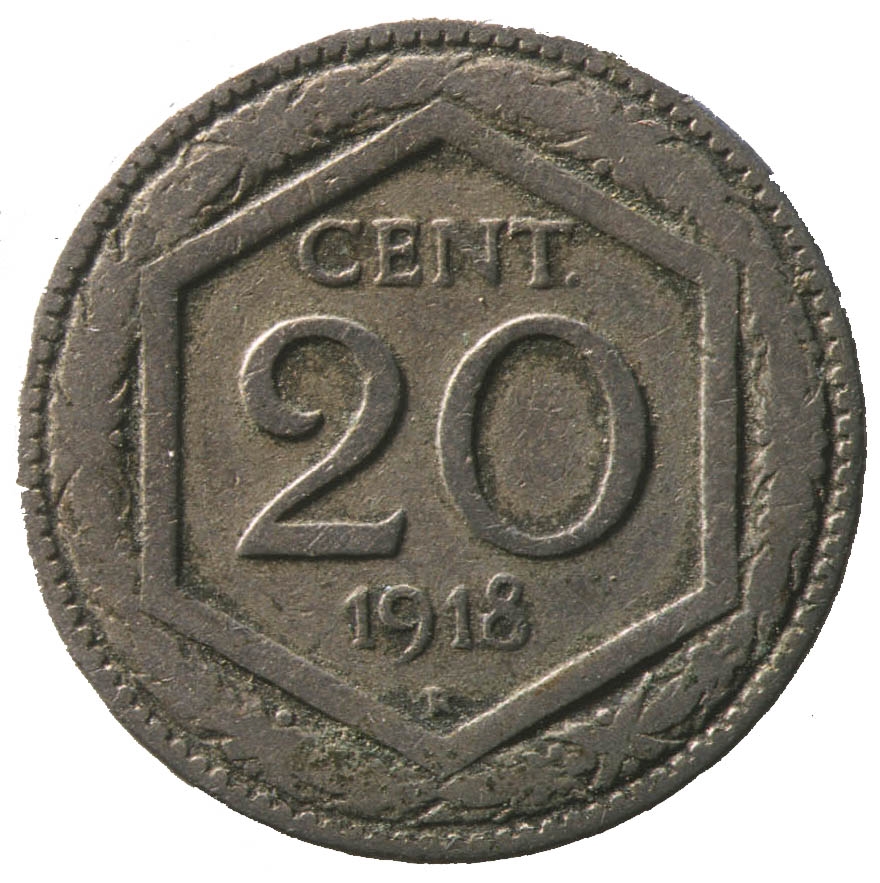 Središnji dio zauzima pravilni šesterokut, u čijem se gornjem djelu nalazi natpis CENT. a ispod njega veliki broj 20. Na dnu šesterokuta nalazi se godina 1918., a ispod nje slovo R. Uz nazubljeni obrub smješten je vjenac od lišća.