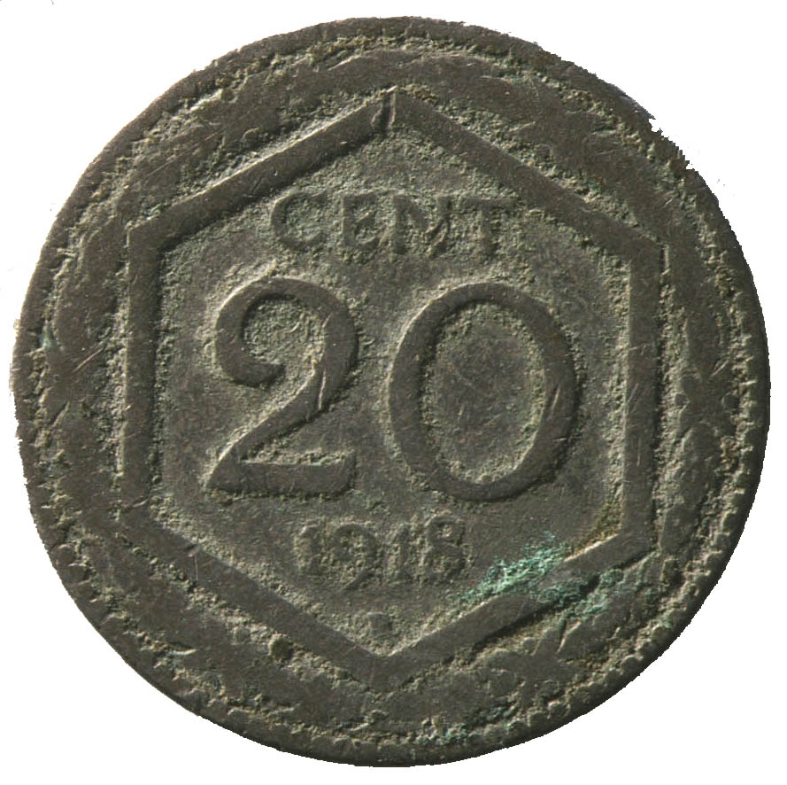 Avers: Središnji dio zauzima grb u obliku štita u čijem se središtu nalazi križ. Iznad štita nalazi se kruna, a bočno i ispod štita grančice sa lišćem. Iznad krune nalazi se polukružni natpis REGNO D''ITALIA. Rub je nazubljen. Revers: Središnji dio zauzima pravilni šesterokut, u čijem se gornjem djelu nalazi natpis CENT. a ispod njega veliki broj 20. Na dnu šesterokuta nalazi se godina 1918., a ispod nje slovo R. Uz nazubljeni obrub smješten je vjenac od lišća.