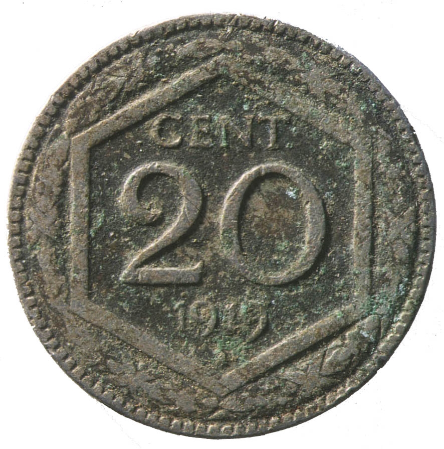 Središnji dio zauzima pravilni šesterokut, u čijem se gornjem djelu nalazi natpis CENT. a ispod njega veliki broj 20. Na dnu šesterokuta nalazi se godina 1919., a ispod nje slovo R. Uz nazubljeni obrub smješten je vjenac od lišća.