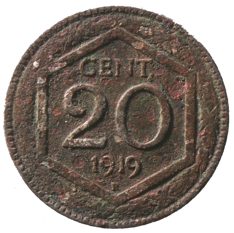 Središnji dio zauzima pravilni šesterokut, u čijem se gornjem djelu nalazi natpis CENT. a ispod njega veliki broj 20. Na dnu šesterokuta nalazi se godina 1919., a ispod nje slovo R. Uz nazubljeni obrub smješten je vjenac od lišća.