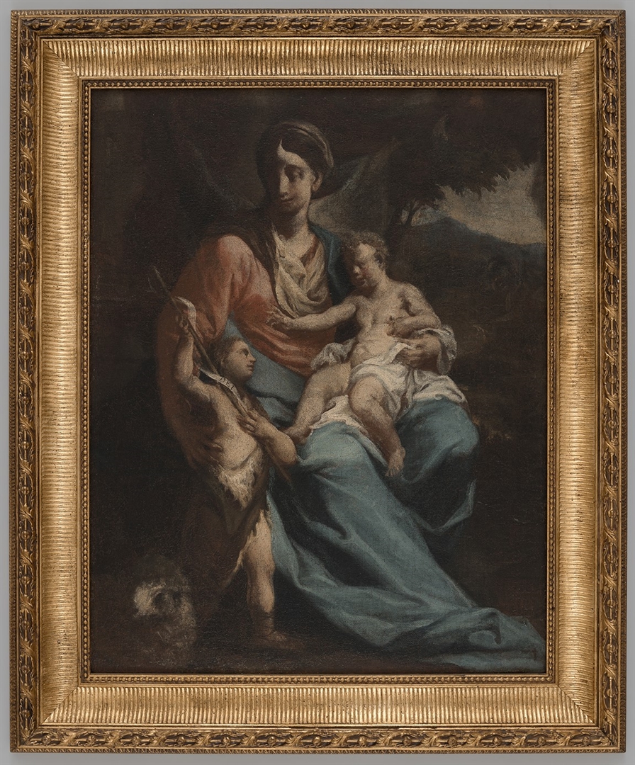 Porijeklo ove slike malog formata nije zabilježeno u inventarima muzeja. Prikazana je Bogorodica s Djetetom u krilu kako sjedi u krajoliku, obgrlivši desnom rukom malog Ivana Krstitelja. Do njegovih nogu je poleglo janje, a iza Bogorodice je poput baldahina postavljena draperija pričvršćena za grane drveća. U pozadini je sumarnim potezima naslikan brdovit predio. Premda je slika bila vrlo oštećena, nečitljiva i s velikim površinama otpale i stanjene boje, restauratorskim je radovima vraćen dio izvorne svježine kolorita te su ponovno uspostavljeni prostorni odnosi svetačkih likova i krajolika u pozadini. Zahvaljujući tomu bilo je moguće prepoznati likovna obilježja i tipologiju figura venecijanskog slikara Francesca Migliorija (1684.-1736.) kojeg je Rodolfo Pallucchini (1996, II:70-76) opisao u kontekstu stvaranja mletačkog rokokoa početkom 18. stoljeća. Određuje ga kao slikara koji naglašeni chiaroscuro i dramatsku napetost iz tradicije tenebrosa obogaćuje naturalističkim akcentima na tragu Antonija Molinarija. Ta su stilska obilježja najupečatljivije ostvarena u izgubljenom ciklusu sa starozavjetnim motivima iz Dresdenagdje se očituju i veze s Federikom Benkovićem i ranim radovima Giambattiste Piazzette. Migliori svoj likovni izraz dopunjuje i utjecajima strožih, akademskih formi baroknog klasicizma Carla Cignanija i Lorenza Pasinellija, da bi uskoro prihvatio imperativ "novog stila" koji je Veneciji nametnuo Sebastiano Ricci. Radoslav Tomić u prijenosu bolonjskih utjecaja značajniju ulogu pridaje ranom Ricciju koji u veneciju prenosi iskustva tamošnje akademije "s jasnim tragovima Carraccijeve i Cortonine umjetnosti" (Tomić 2000:161), dok Giuseppe Pavanello (1997b:90-91) kod Migliorija ističe "akademsku lekciju" Antonija Balestre. Slika iz rovinjskog muzeja pripada završnom razdoblju Migliorijeve karijere kada su utjecaji novog ukusa i Riccijevih kromatskih odnosa najizraženiji. Karakteristično je slikanje Bogorodičine odjeće blistavog kolorita i fluidnog ritma nabora draperije, kao i sintetički potezi kojim je oblikovano nago tijelo malog Isusa ili krzno Ivana Krstitelja. Najviše podudarnosti rovinjska slika pokazuje s oltarnom palom Bogorodice sa svecima iz župne crkve u San Michele di Piave (Treviso) koju je u opus Francesca Migliorija nedavno uključio Giorgio Fossaluzza (u: Fondazione 1999:260) povezujući je s kasnim slikarevim djelima za Crkvu San Marcuola u Veneciji iz tridesetih godina 18. stoljeća. Na rovinjsku se sliku može u potpunosti primijeniti Fossaluzzino zapažanje da se prilagodba Riccijevim kromatskim rješenjima odvijala "putem blistavog svjetla koje oživljava kolorit u prisutnosti još uvijek snažne kjaroskuralne napetosti, no uz izraženiji karakter akademskih formi". Premda se radi o malom formatu i konvencijalnoj kompoziciji, može se iščitati i za Migliorija tipično postavljanje figura koso u prostor u suprotstavljenim smjerovima koje slijede višestruku, složenu mrežu ukrižanih dijagonala. Rovinjskoj su Bogorodici bliska i kasna Migliorijeva djela manjeg formata popust slika s ograde pjevališta u Crkvi San Moisè (oko 1728.) u Veneciji, pandani Smrt sv. Josipa i Poklonstvo kraljeva iz privatne zbirke u Lavarianu (Udine) te u određenoj mjeri i nedavno objavljeni ovali iz trogirske katedrale (usp. Fossaluzza 1997a:182-183, 212-213, sl. 55-58; Pavanello 1997b:90-91; 1999:72-74) prepoznaje nezaobilazan utjecaj Antonija Balestre. Navedenim djelima zbog srodnosti s rovinjskom slikom svakako treba pridružiti još neobjavljeni ciklus iz župne crkve u Makarskoj, na koji me ljubazno upozorila Zoraida Demori-Staničić i koji se ovdje pripisuje Francescu Miglioriju (tekst je u pripremi). Ciklus čine tri kompozicije: Evanđelisti Ivan i Matija, Evanđelisti Marko i Luka te Krist u Hramu. Manji formati i dimenzije, uz odabir motiva, upućuju na to da su slike izvorno ukrašavale ogradu propovjedaonice. Pokazuju analogna kromatska i tipološka rješenja te bliskosti s rahlim, slobodnim potezom kojim slikar oblikuje krajolik u pozadini rovinjske slike te ih vjerojatno treba povezati s istim odsječkom Migliorijeve karijere u kojem nastaje i Bogorodica s Djetetom i malim Ivanom Krstiteljem. Tipologija likova pak na svim spomenutim Migliorijevim djelima ostaje gotovo nepromijenjena. Ponavljanje istih fizionomija i stavova može se pratiti i na Poklonstvu pastira iz Národní Galerie u Pragu (Daniel, u: Tesori di Praga 1996:196-197, kat. 59). Premda se slika datira u nešto ranije razdoblje i prema Ladislavu danielu predstavlja model za veću kompoziciju, zamjećuju se slikarska rješenja i kromatska obilježja podudarna onima na rovinjskoj slici i na ciklusu iz Makarske: fluidni ritam nabora draperija, intenzivan kolorit oživljen jarkom svjetlošću i podcrtan kjaroskuralnim efektima te sintetičan potez. (Višnja Bralić u: Slikarska baština istre, 2006., str. 478-479)