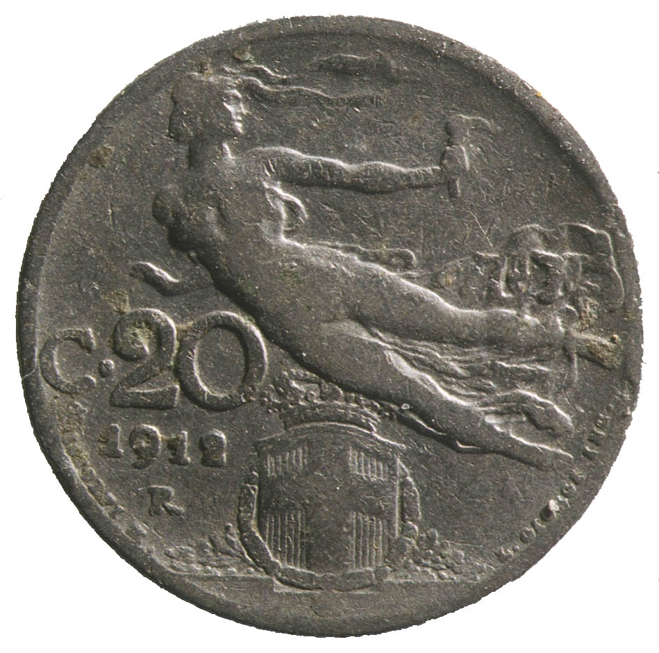 Avers: Profil žene u lijevo, koja u ruci drži klas pšenice iznad kojeg se, prateći rub kovanice, nalazi natpis ITALIA. Revers: Dvije trećine kovanice zauzima prikaz gole žene u letu koja u lijevoj ruci drži baklju. Uz lijevi rub kovanice nalazi se natpis C.20, a ispod njega godina 1912. i slovo R. Na dnu se nalazi grb u obliku štita u čijem se središtu nalazi križ. Iznad središnjeg djela štita nalazi se kruma.