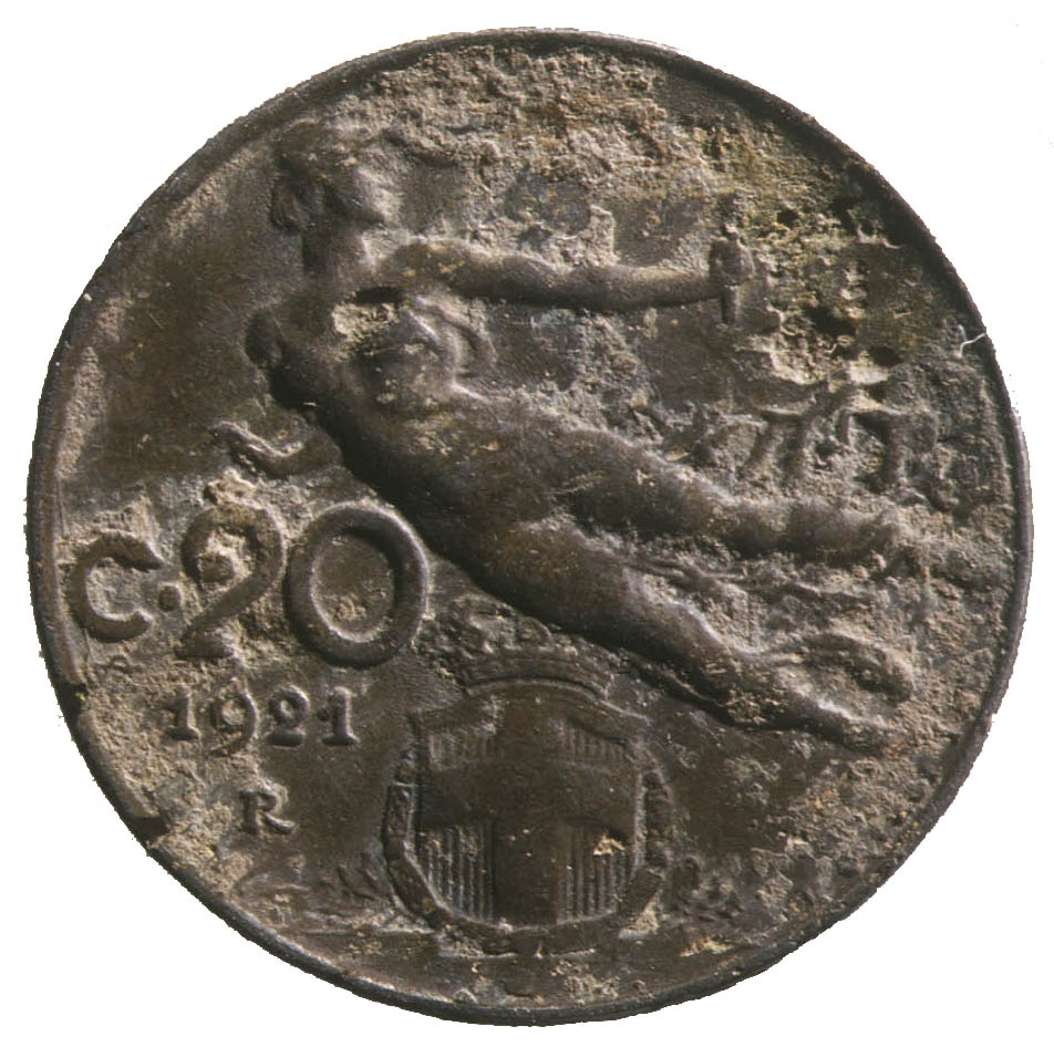 Dvije trećine kovanice zauzima prikaz gole žene u letu koja u lijevoj ruci drži baklju. Uz lijevi rub kovanice nalazi se natpis C.20, a ispod njega godina 1921. i slovo R. Na dnu se nalazi grb u obliku štita u čijem se središtu nalazi križ. Iznad središnjeg djela štita nalazi se kruma.