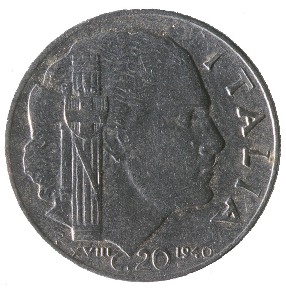Centralni dio kovanice zauzima profil ženske osobe sa pogledom u desno. Sa njezine lijeve strane nalazi se fascio, a ispod njega slovo R i rimski brojXVIII. Uz desni rub nalazi se natpis ITALIA, a na dnu C.20 i godina 1940.