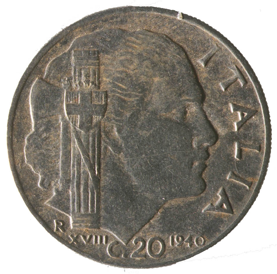 Centralni dio kovanice zauzima profil ženske osobe sa pogledom u desno. Sa njezine lijeve strane nalazi se fascio, a ispod njega slovo R i rimski brojXVIII. Uz desni rub nalazi se natpis ITALIA, a na dnu C.20 i godina 1940.