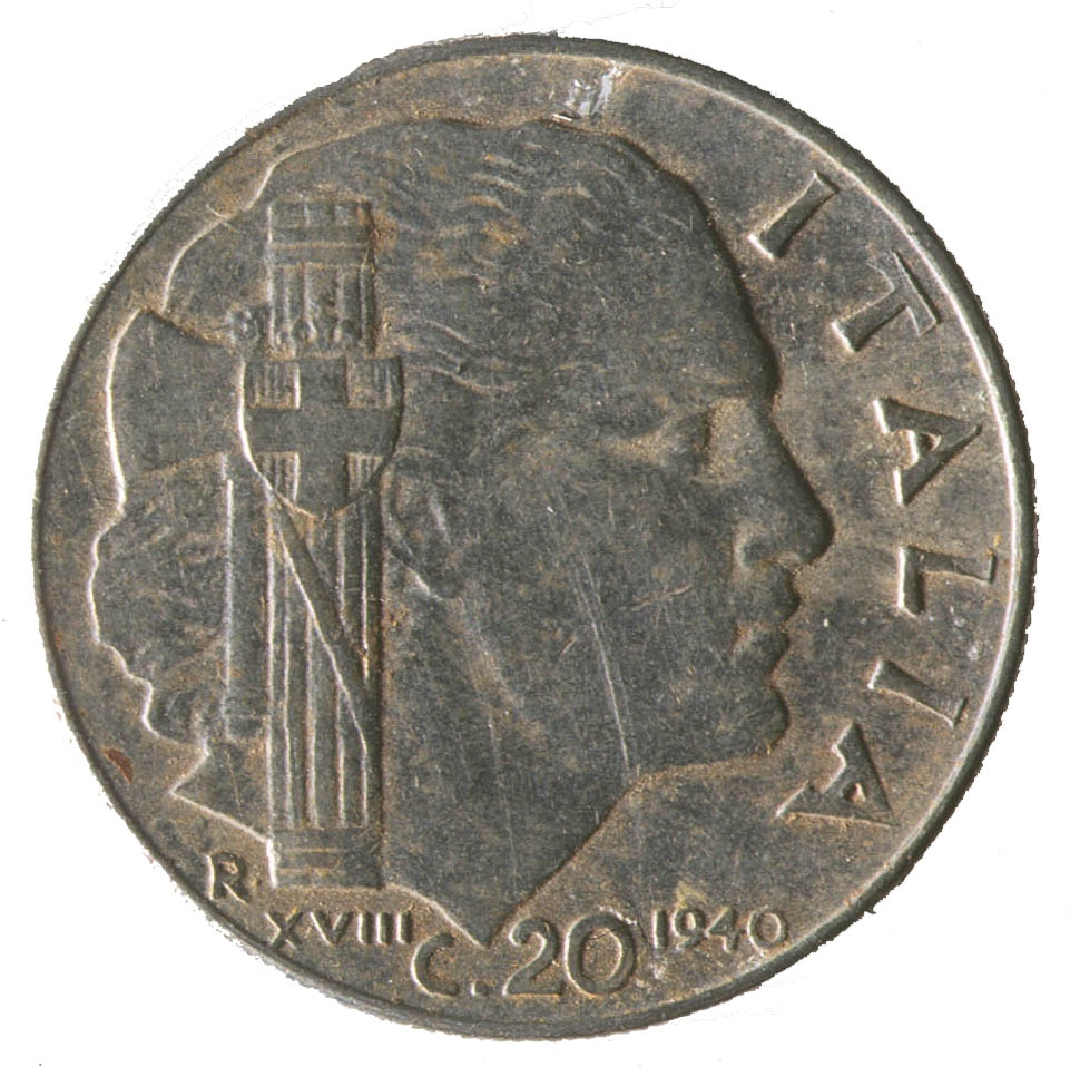 Centralni dio kovanice zauzima profil ženske osobe sa pogledom u desno. Sa njezine lijeve strane nalazi se fascio, a ispod njega slovo R i rimski brojXVIII. Uz desni rub nalazi se natpis ITALIA, a na dnu C.20 i godina 1940.