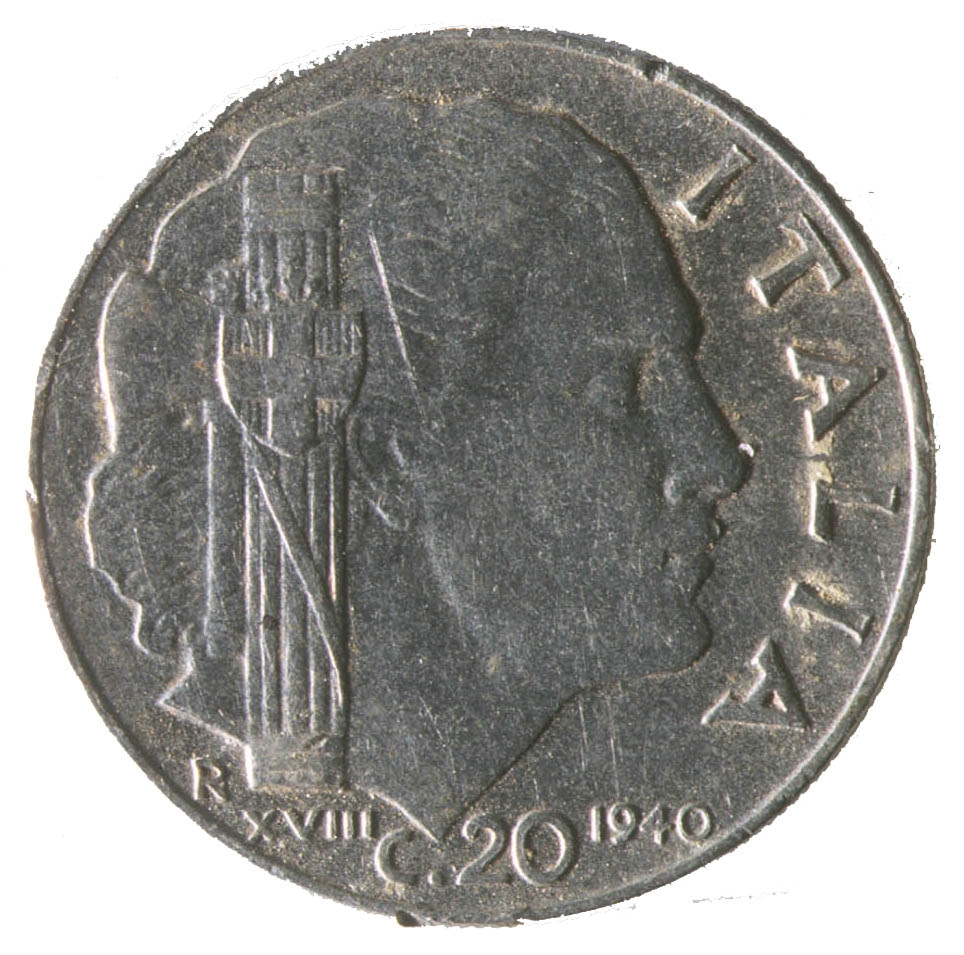 Centralni dio kovanice zauzima profil ženske osobe sa pogledom u desno. Sa njezine lijeve strane nalazi se fascio, a ispod njega slovo R i rimski brojXVIII. Uz desni rub nalazi se natpis ITALIA, a na dnu C.20 i godina 1940.