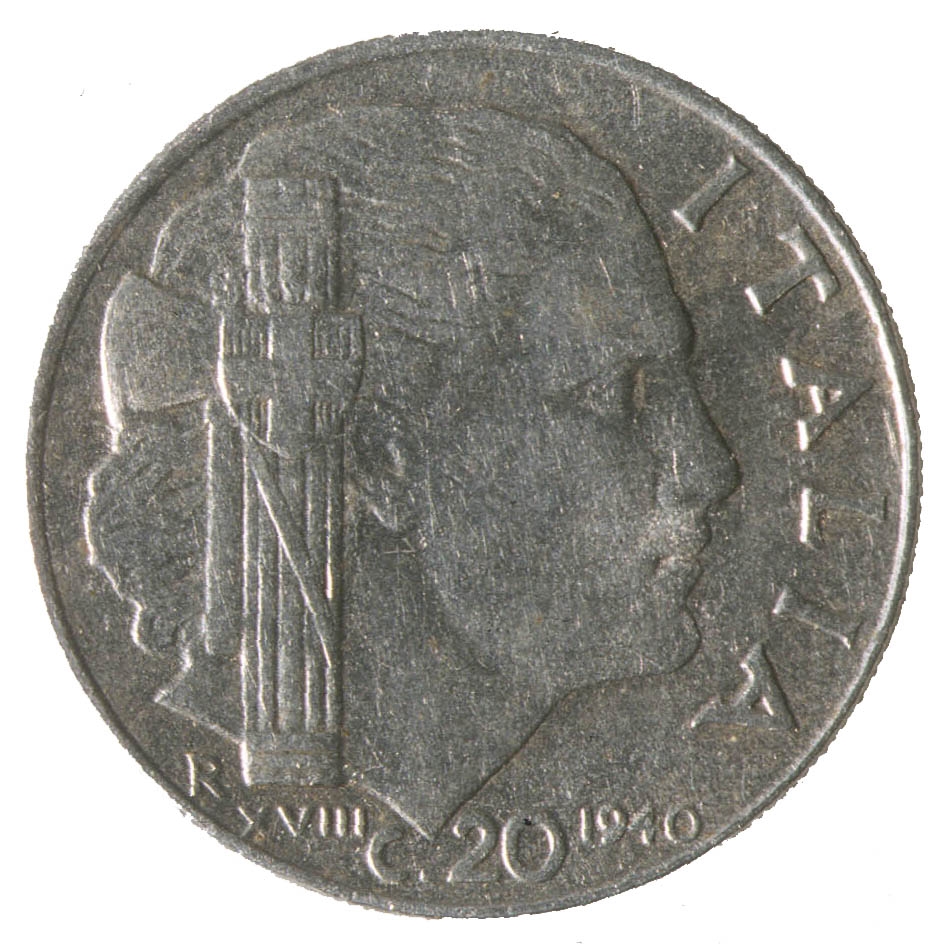 Centralni dio kovanice zauzima profil ženske osobe sa pogledom u desno. Sa njezine lijeve strane nalazi se fascio, a ispod njega slovo R i rimski brojXVIII. Uz desni rub nalazi se natpis ITALIA, a na dnu C.20 i godina 1940.