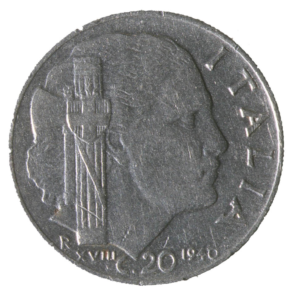 Centralni dio kovanice zauzima profil ženske osobe sa pogledom u desno. Sa njezine lijeve strane nalazi se fascio, a ispod njega slovo R i rimski brojXVIII. Uz desni rub nalazi se natpis ITALIA, a na dnu C.20 i godina 1940.