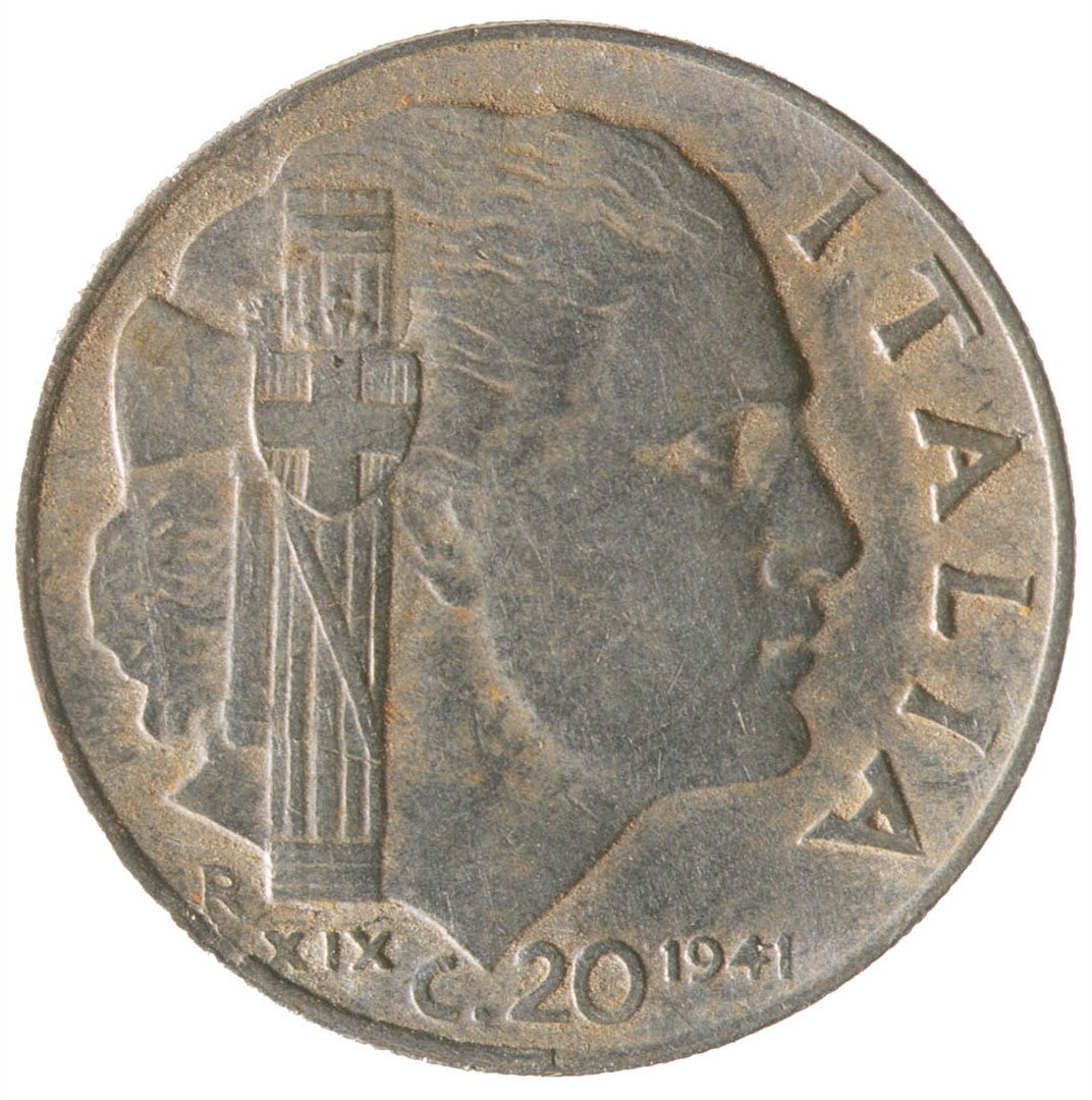 Centralni dio kovanice zauzima profil ženske osobe sa pogledom u desno. Sa njezine lijeve strane nalazi se fascio, a ispod njega slovo R i rimski brojXIX. Uz desni rub nalazi se natpis ITALIA, a na dnu C.20 i godina 1941.