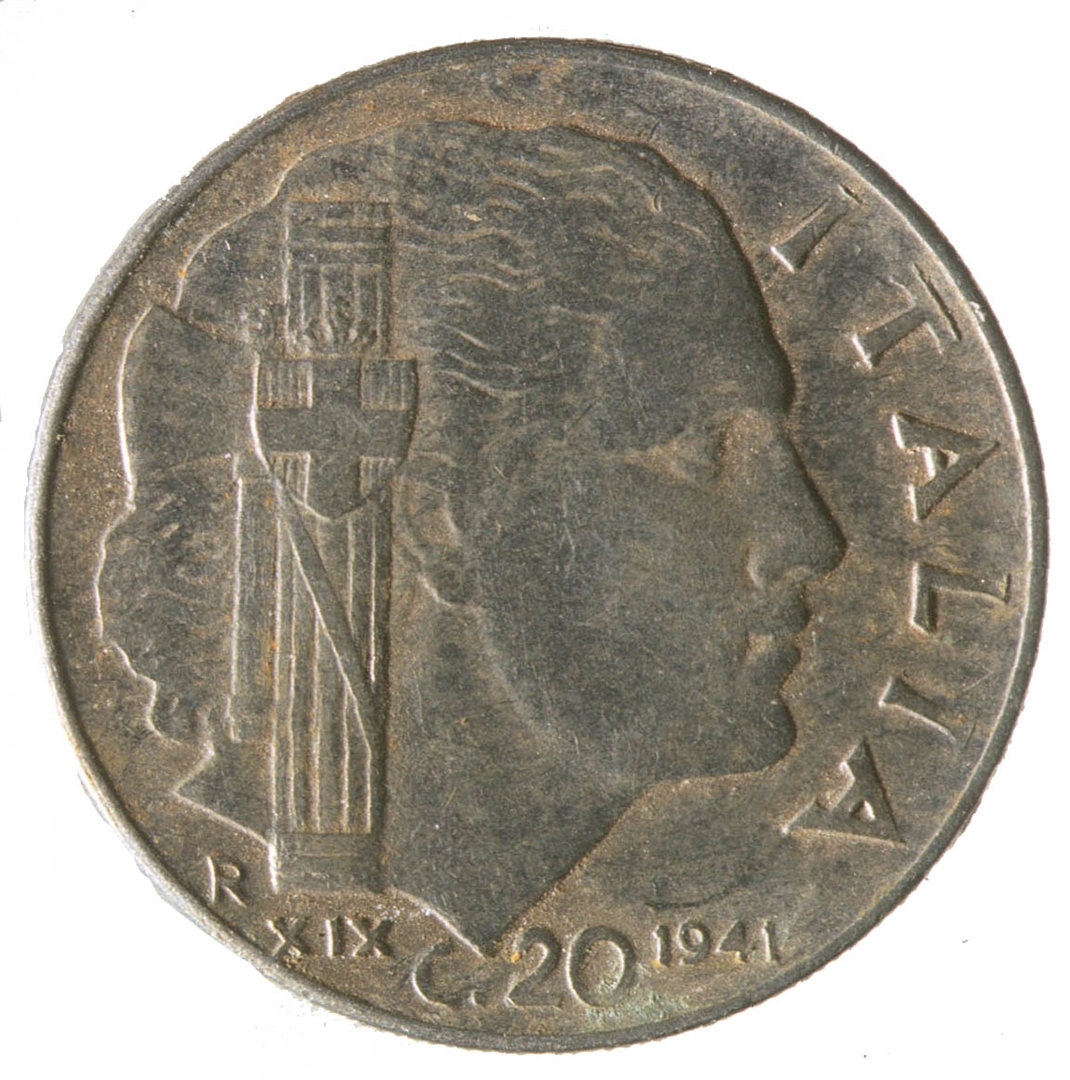 Centralni dio kovanice zauzima profil ženske osobe sa pogledom u desno. Sa njezine lijeve strane nalazi se fascio, a ispod njega slovo R i rimski brojXIX. Uz desni rub nalazi se natpis ITALIA, a na dnu C.20 i godina 1941.