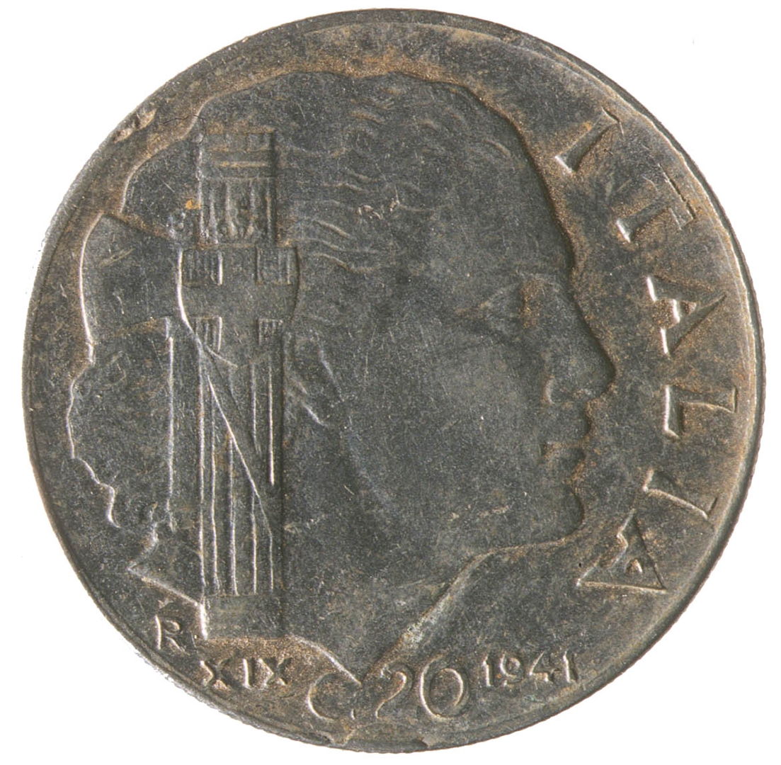 Centralni dio kovanice zauzima profil ženske osobe sa pogledom u desno. Sa njezine lijeve strane nalazi se fascio, a ispod njega slovo R i rimski brojXIX. Uz desni rub nalazi se natpis ITALIA, a na dnu C.20 i godina 1941.