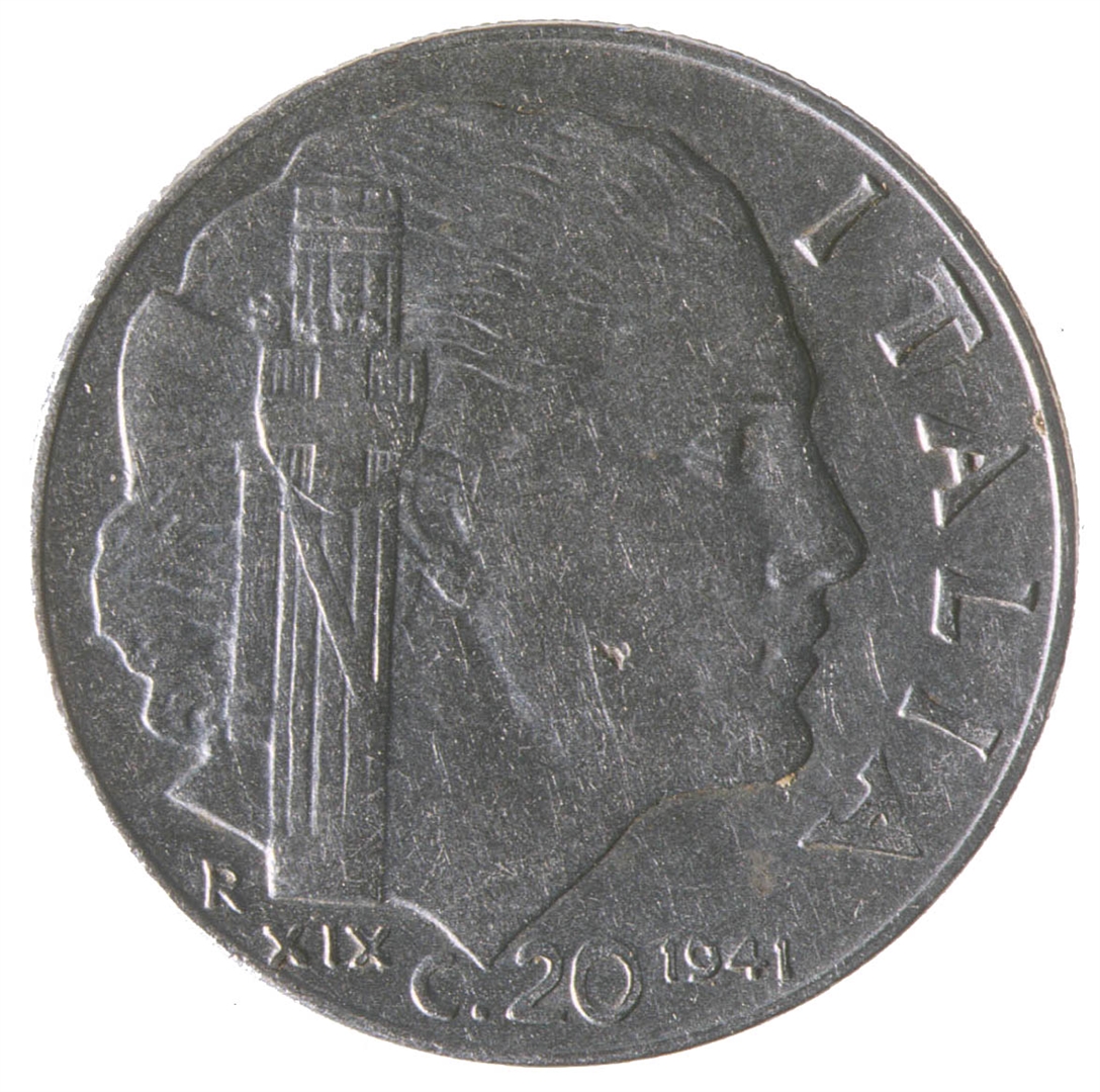 Centralni dio kovanice zauzima profil ženske osobe sa pogledom u desno. Sa njezine lijeve strane nalazi se fascio, a ispod njega slovo R i rimski brojXIX. Uz desni rub nalazi se natpis ITALIA, a na dnu C.20 i godina 1941.