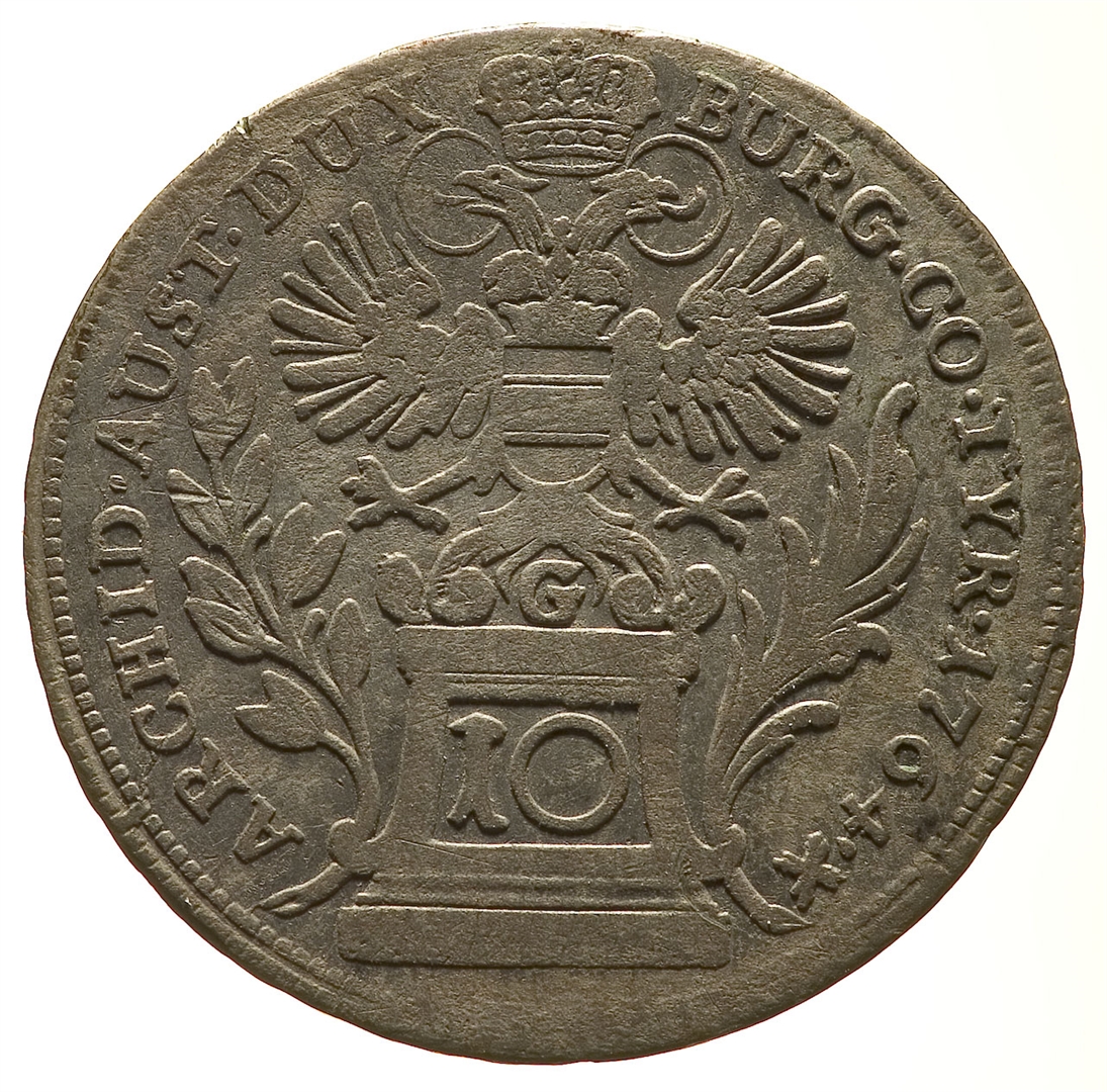 Avers: Prohil Marije Tereze sa pogledom u desno.Središnji dio okružuje grančica lovora i palme, a uz rub je natpis M·THERESIA·D.G·R·IMP·GE.HU·BO·REG· Revers: U donjem djelu nalazi se postament u čijem se središtu nalazi broj 10 (nominala). Na njemu se nalazi dvoglavi orao iznad kojeg se nalazi kruna, a između kanđi slovo G oznaka kovnice. Uz rub natpis ARCHID·AUST·DUX·BURG·CO·TYR·1764·X