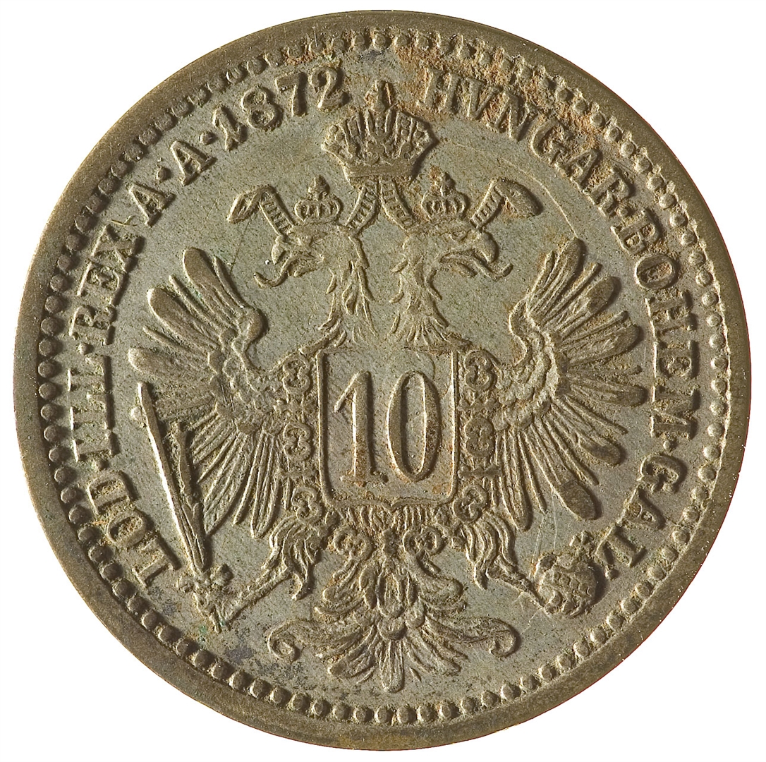 U središnjem djelu dvoglavi orao iznad kojeg se nalazi kruna, a u sredini broj 10 (nominala). Uz rub natpis HUNGAR·BOHEM·GAL·LOD·ILL·REX A·A·1872