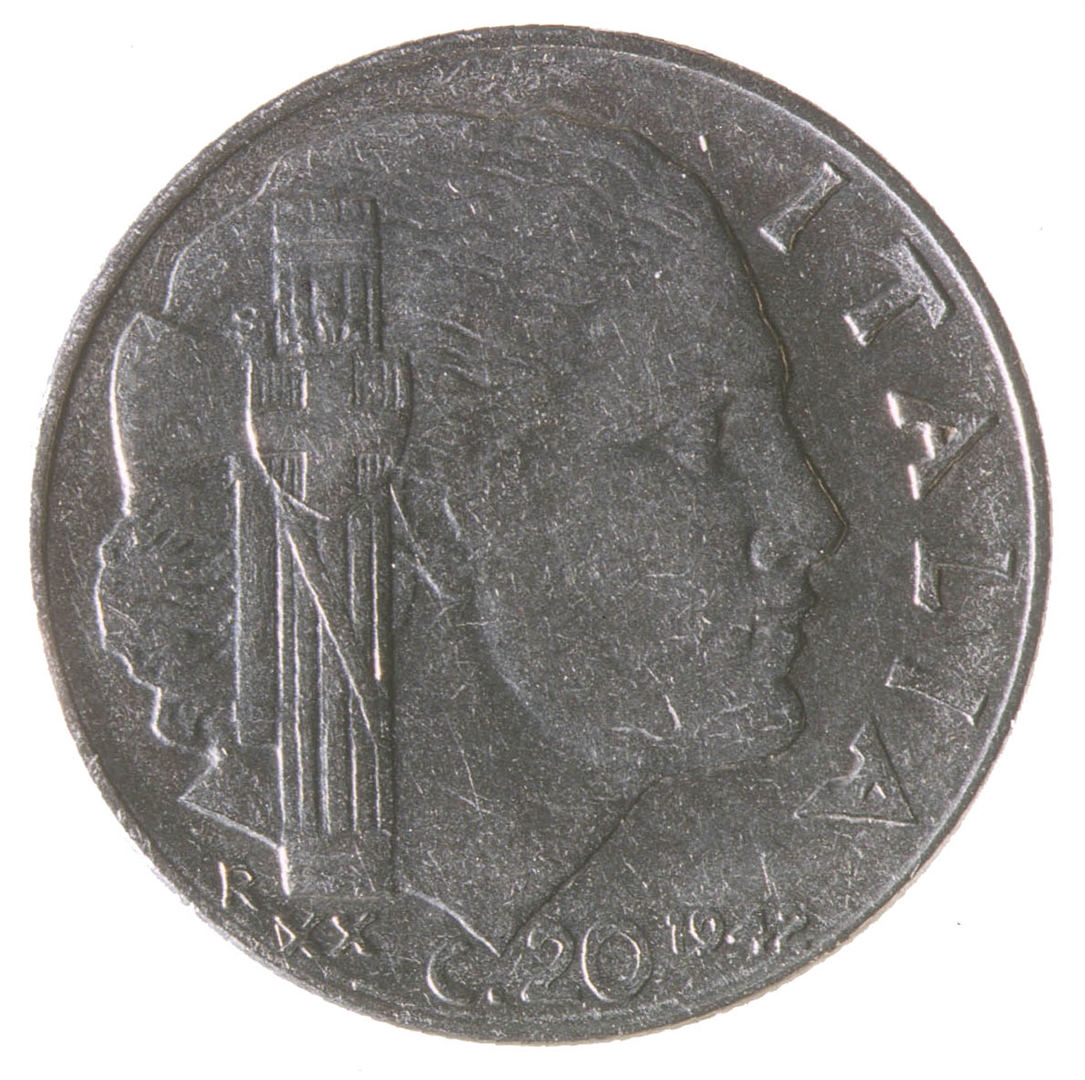 Centralni dio kovanice zauzima profil ženske osobe sa pogledom u desno. Sa njezine lijeve strane nalazi se fascio, a ispod njega slovo R i rimski brojXX. Uz desni rub nalazi se natpis ITALIA, a na dnu C.20 i godina 1942.