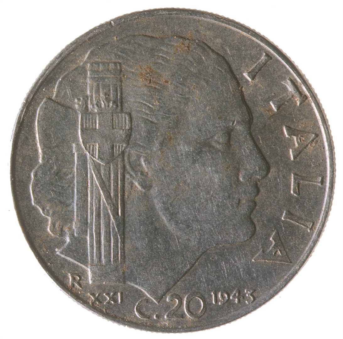 Centralni dio kovanice zauzima profil ženske osobe sa pogledom u desno. Sa njezine lijeve strane nalazi se fascio, a ispod njega slovo R i rimski brojXXI. Uz desni rub nalazi se natpis ITALIA, a na dnu C.20 i godina 1943.