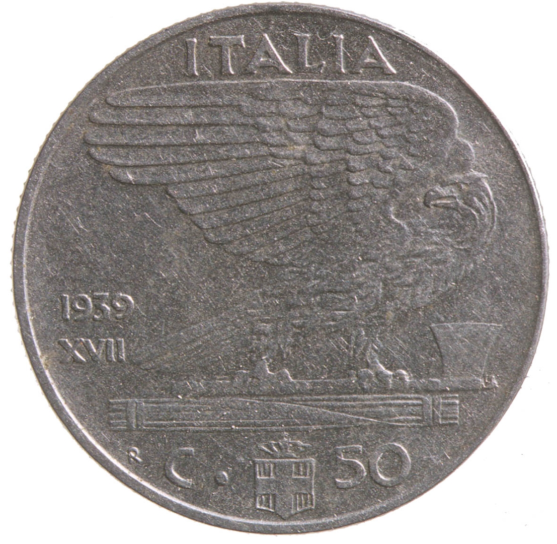 Centralni dio reversa zauzima prikaz orla raširenih krila koji u kanđama drži fascio. Iznad njega nalazi se natpis ITALIA, a sa njegove desne strane godina 1939 i rimski broj XVII. U dnu na sredini nalazi se grb s čije se desne strane nalazi broj 50, a sa lijeve strane slovo C. Lijevo od slova C nalazi se malo slovo R.