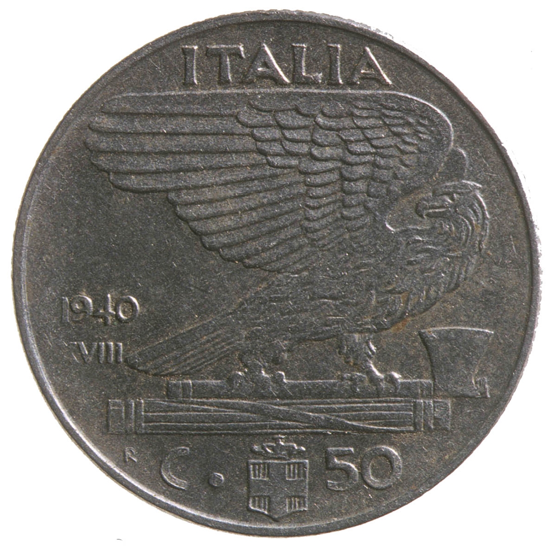 Centralni dio reversa zauzima prikaz orla raširenih krila koji u kanđama drži fascio. Iznad njega nalazi se natpis ITALIA, a sa njegove desne strane godina 1940 i rimski broj XVIII. U dnu na sredini nalazi se grb s čije se desne strane nalazi broj 50, a sa lijeve strane slovo C. Lijevo od slova C nalazi se malo slovo R.