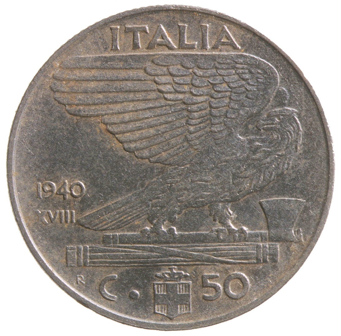 Centralni dio reversa zauzima prikaz orla raširenih krila koji u kanđama drži fascio. Iznad njega nalazi se natpis ITALIA, a sa njegove desne strane godina 1940 i rimski broj XVIII. U dnu na sredini nalazi se grb s čije se desne strane nalazi broj 50, a sa lijeve strane slovo C. Lijevo od slova C nalazi se malo slovo R.