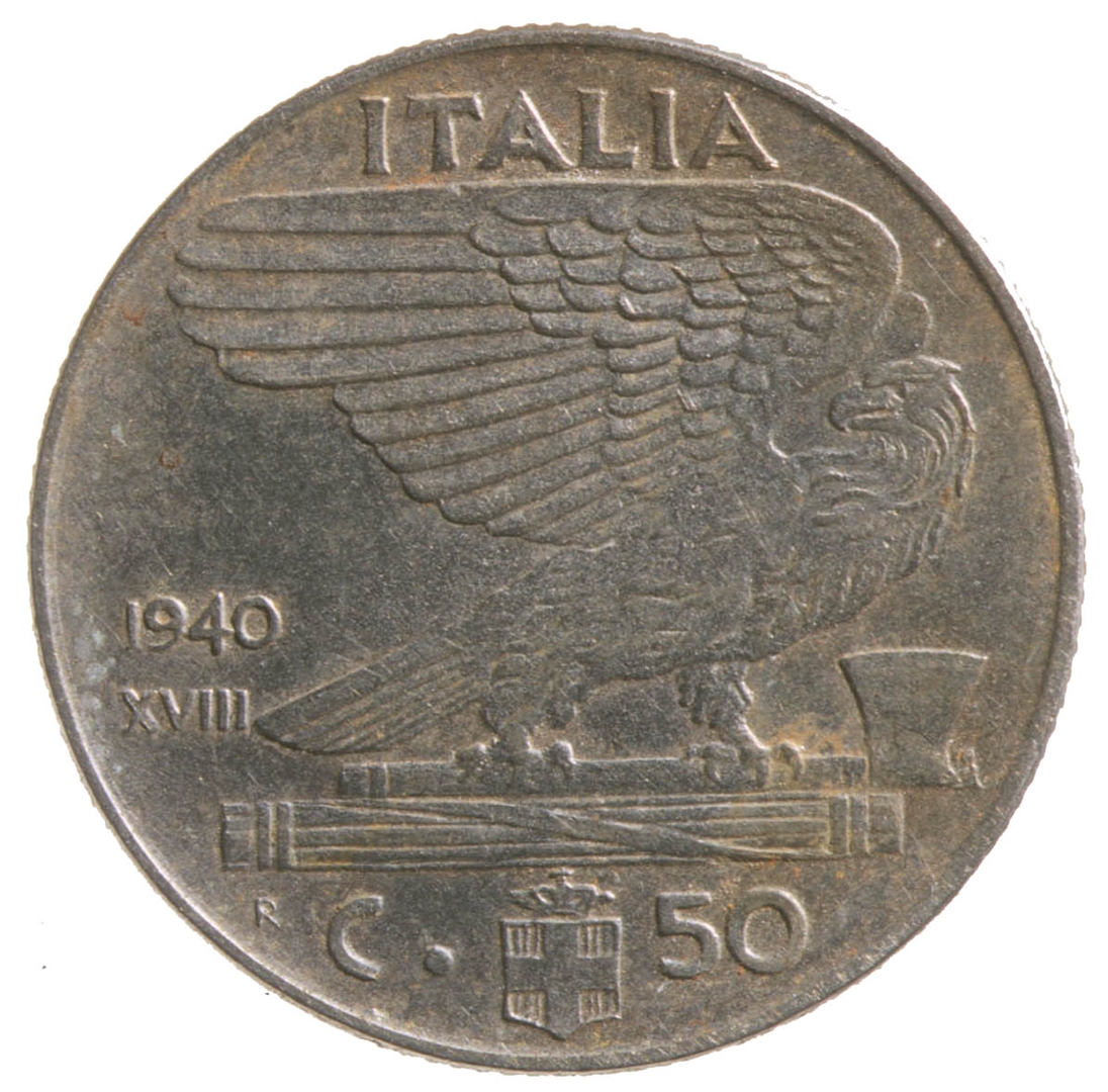 Centralni dio reversa zauzima prikaz orla raširenih krila koji u kanđama drži fascio. Iznad njega nalazi se natpis ITALIA, a sa njegove desne strane godina 1940 i rimski broj XVIII. U dnu na sredini nalazi se grb s čije se desne strane nalazi broj 50, a sa lijeve strane slovo C. Lijevo od slova C nalazi se malo slovo R.
