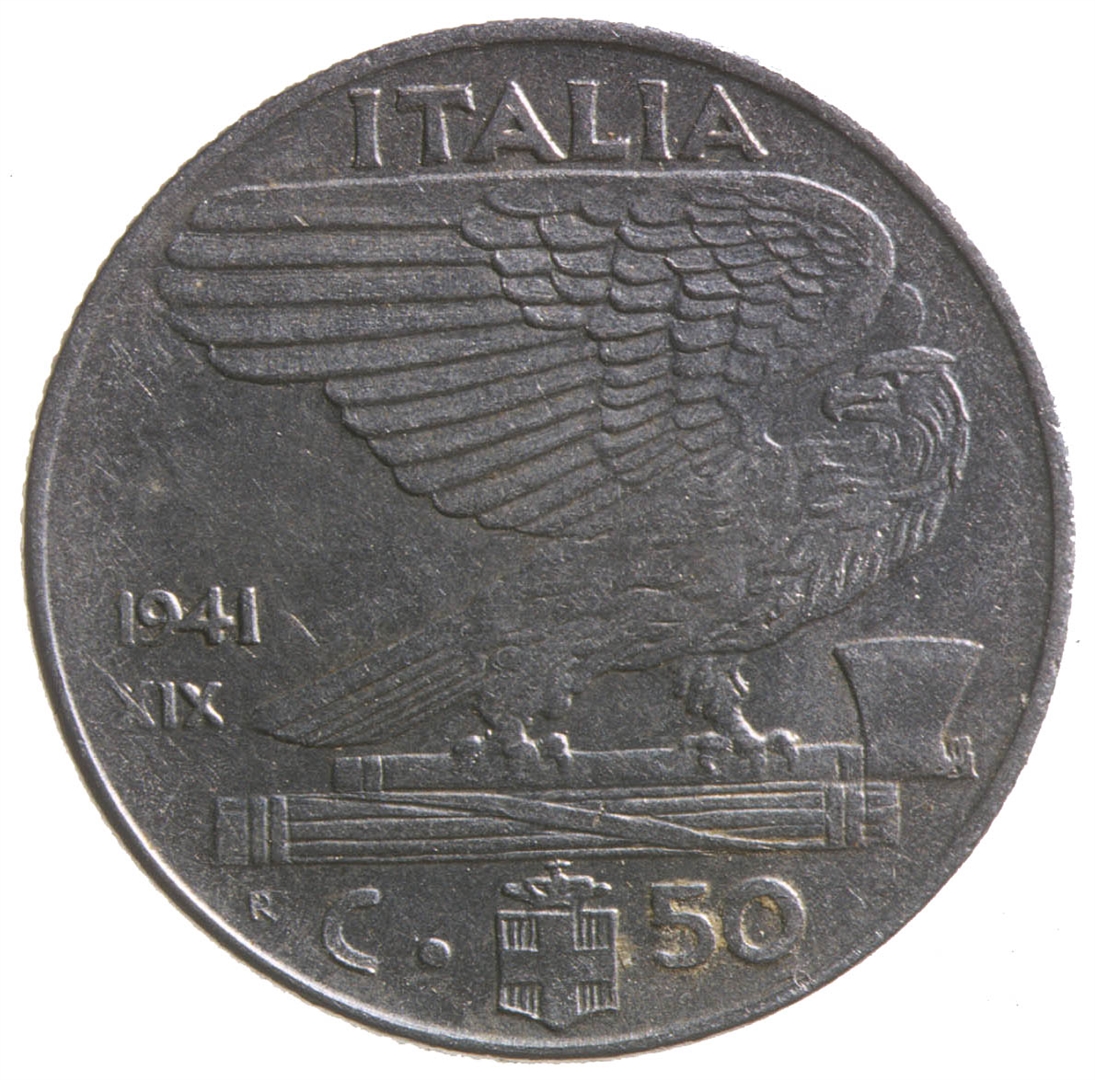 Centralni dio reversa zauzima prikaz orla raširenih krila koji u kanđama drži fascio. Iznad njega nalazi se natpis ITALIA, a sa njegove desne strane godina 1941 i rimski broj XIX. U dnu na sredini nalazi se grb s čije se desne strane nalazi broj 50, a sa lijeve strane slovo C. Lijevo od slova C nalazi se malo slovo R.