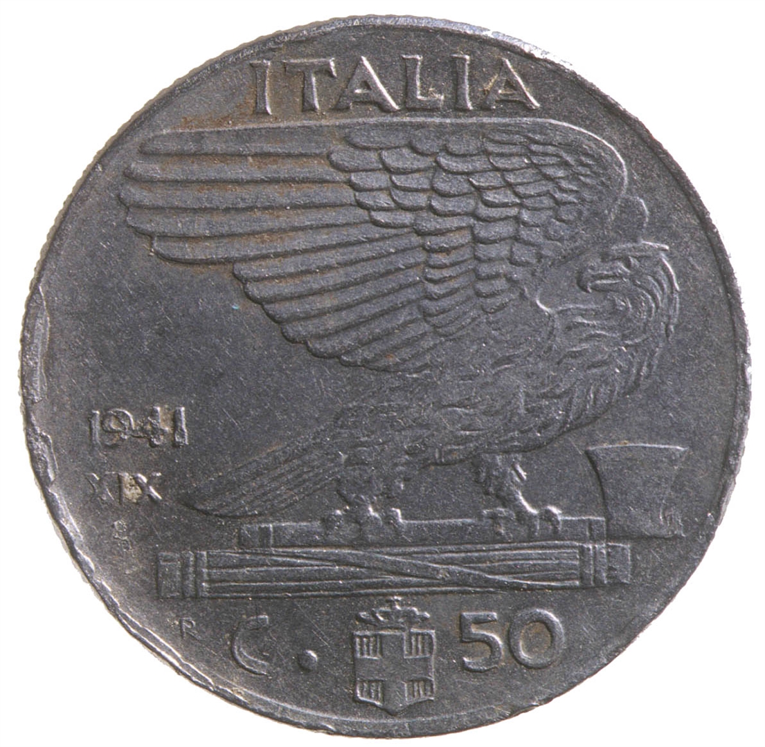 Centralni dio reversa zauzima prikaz orla raširenih krila koji u kanđama drži fascio. Iznad njega nalazi se natpis ITALIA, a sa njegove desne strane godina 1941 i rimski broj XIX. U dnu na sredini nalazi se grb s čije se desne strane nalazi broj 50, a sa lijeve strane slovo C. Lijevo od slova C nalazi se malo slovo R.