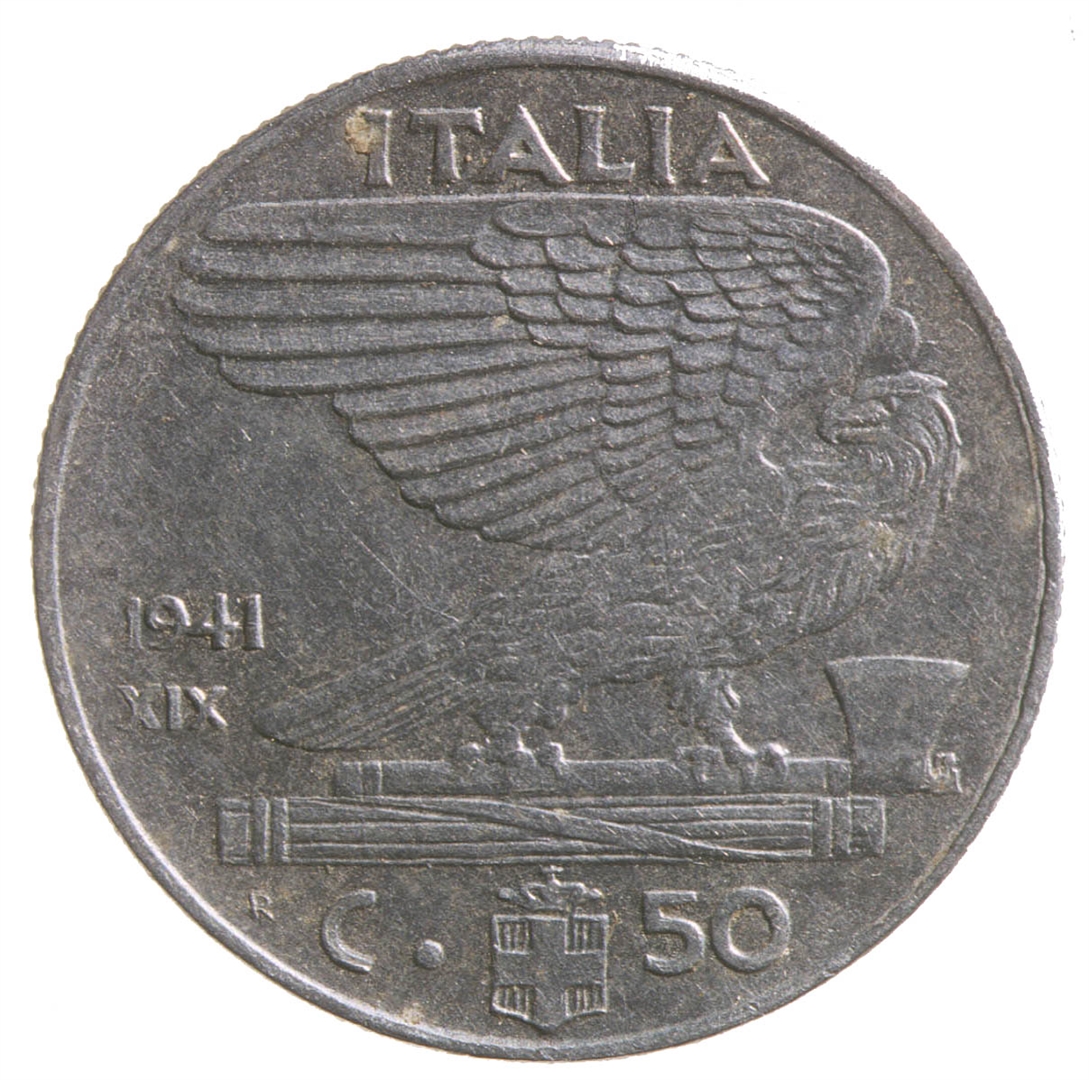 Centralni dio reversa zauzima prikaz orla raširenih krila koji u kanđama drži fascio. Iznad njega nalazi se natpis ITALIA, a sa njegove desne strane godina 1941 i rimski broj XIX. U dnu na sredini nalazi se grb s čije se desne strane nalazi broj 50, a sa lijeve strane slovo C. Lijevo od slova C nalazi se malo slovo R.